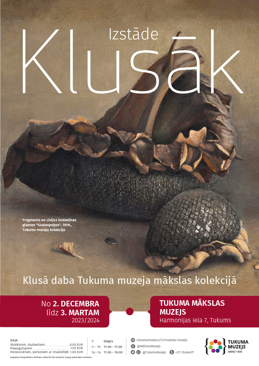 No 2. decembra līdz 2024. gada 3. martam Tukuma Mākslas muzejā atvērta izstāde “KLUSĀK. Klusā daba Tukuma muzeja mākslas kolekcijā”. Skatāmi Tukuma muzeja mākslas kolekcijas skaistākie klusās dabas žanra darbi.