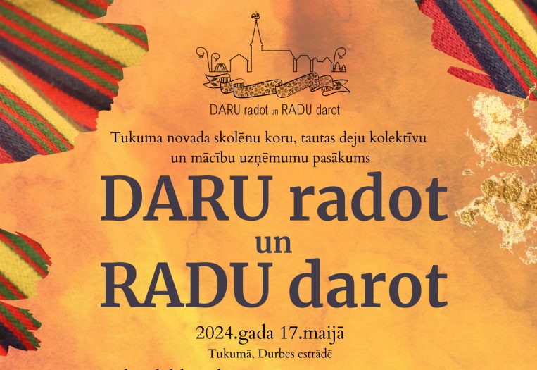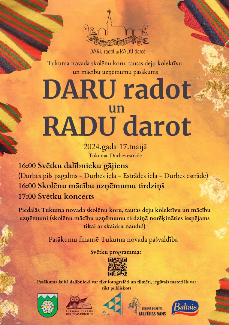 Ceļā uz XIII Latvijas Skolu jaunatnes dziesmu un deju svētkiem 17. maijā Durbes estrādē Tukumā notiks Tukuma novada izglītības un kultūras iestāžu tautas deju kolektīvu un skolēnu mācību uzņēmumu pasākums „Daru radot un Radu darot”.