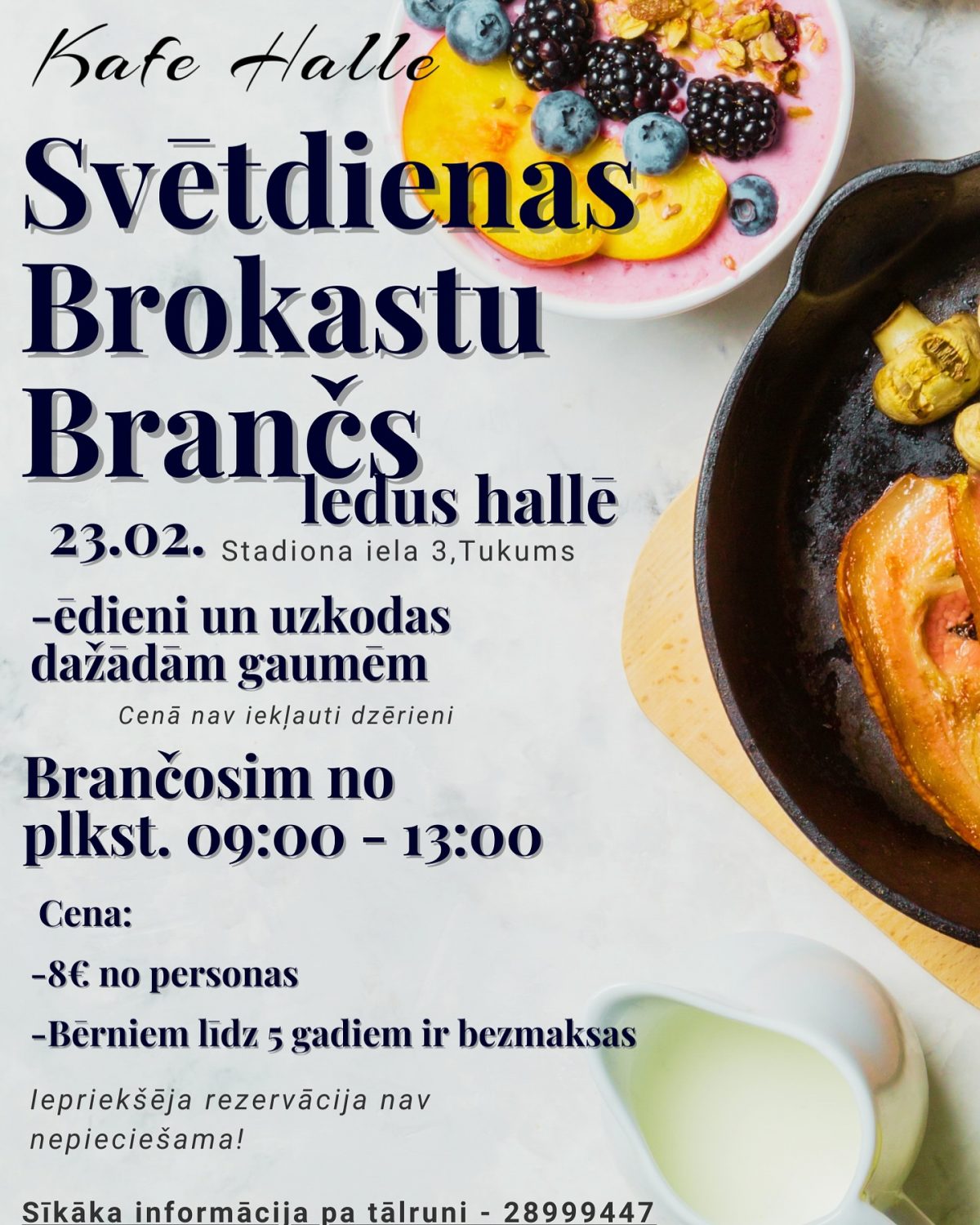 Šo svētdien no plkst. 09:00 līdz 13:00 Tukuma Ledus hallē aicinām uz brokastu branču. Brančs ir lieliska iespēja sākt dienu lēni un nesteidzīgi kopā ar ģimeni vai draugiem. Piedāvājumā – uzkodas, siltie ēdieni un dažādi gardumi ikvienai gaumei. Bērniem līdz 5 gadu vecumam – bez maksas. Adrese: Tukuma ledus halle, Stadiona iela 3, Tukums. Vairāk informācijas: 28999447