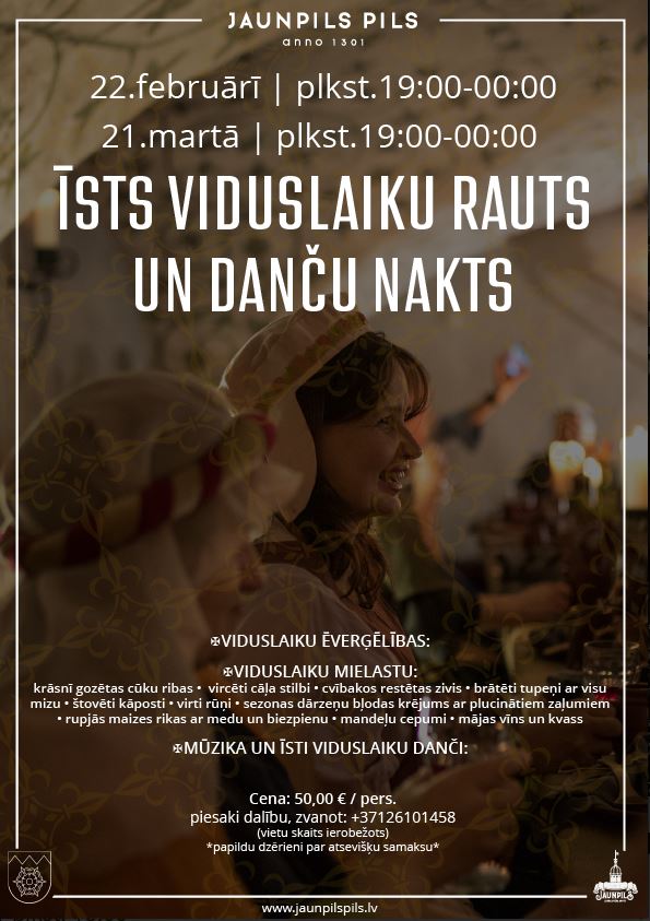 Jaunpils pilī sestdien gaidāms “Īsts viduslaiku rauts un danči”, kas piedāvās unikālu iespēju iejusties senās vēstures atmosfērā. Plkst. 19:00 viesus sagaidīs aizraujošas aktivitātes pils senajā pagrabā, kur būs iespēja iepazīt viduslaiku tradīcijas un spēles. Ikviens tiks ietērpts stilizētos tērpos, lai radītu autentisku gaisotni. Vakara kulminācijā viesi baudīs bagātīgu viduslaiku mielastu pie lielā saimes galda, bet noslēgumā – mūzika un dejas, kas aizvedīs īstenā senlaicīgā svētku virpulī. Vietu skaits ierobežots, tāpēc aicinām pieteikties savlaicīgi, zvanot pa tālruni. Dalības maksu iespējams apmaksāt vietnē bezrindas.lv šeit. Adrese: “Jaunpils pils”, Jaunpils, Jaunpils pagasts, Tukuma novads. Vairāk informācijas: 26101458, www.jaunpilspils.lv