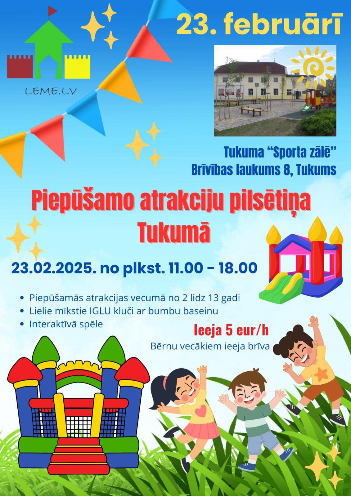 Ja pārgājienu mīļotāji neesat, tad nedēļas izskaņā no plkst. 11:00 līdz 18:00 pašā Tukuma centrā – Invalīdu sporta skolā viesosies “Piepūšamo atrakciju pilsētiņa”. Mazie enerģijas pilnie ķipari varēs izlēkāties un izbaudīt dažādas atrakcijas, kamēr vecāki – atpūsties. Vecākiem iespēja baudīt gardas maltītes un kafiju netālu esošajā kafejnīcā “Kukul Elizabete” vai turpat ļauties priekam kopā ar visu ģimeni.