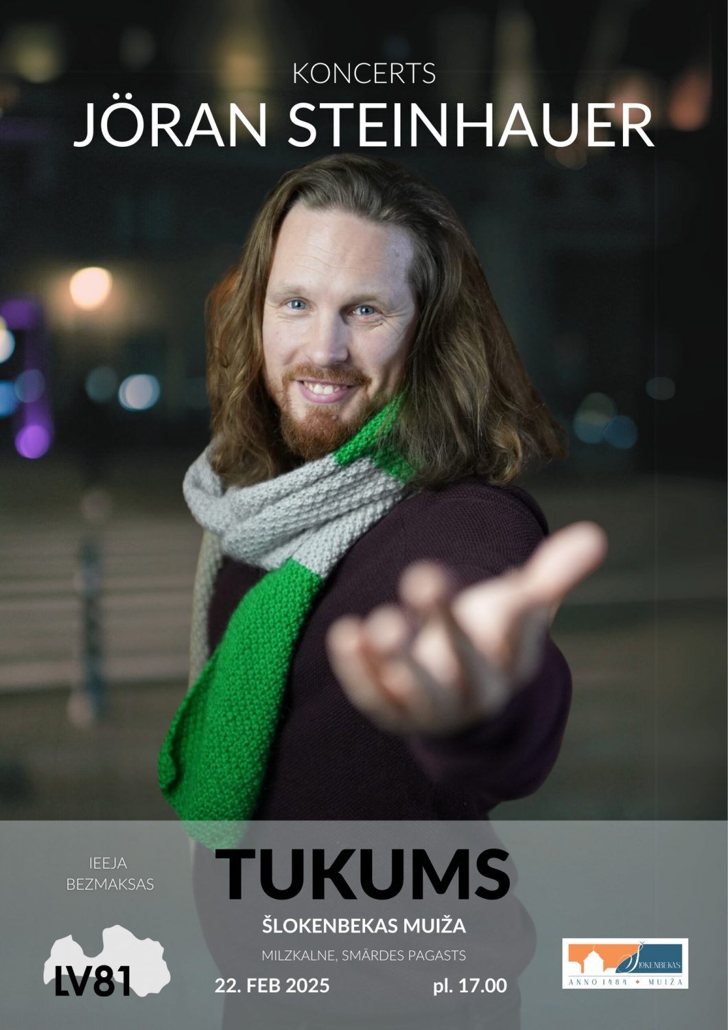 Sestdienas vakarā plkst. 19:00 Šlokenbekas muižā gaidāms īpašs muzikāls vakars kopā ar Joran Steinhauer – dziesmu “Paldies, latiņam” un “Cep cep kūku” autoru. Ar savu sirsnību un enerģiju viņš radīs neaizmirstamu atmosfēru, kurā ikviens varēs baudīt mūziku un labu noskaņojumu. Pasākums ir bezmaksas, tāpēc aicinām visus pievienoties un izbaudīt sirsnīgu vakaru. Adrese: Šlokenbekas muiža, Milzkalne, Smārdes pagasts, Tukuma novads. Vairāk informācijas: 29904147