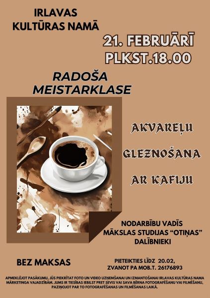 Nedēļas nogali iesāksim piektdienā uz radošas nots, jo vakarā plkst. 18:00 Irlavas mākslas studija “Otiņas” aicina uz unikālu meistarklasi – akvareļu gleznošanu ar kafiju. Pasākums notiks Irlavas kultūras namā, kur dalībniekiem būs iespēja apgūt neparastu tehniku un radīt savus mākslas darbus. Dalība ir bez maksas, taču vietu skaits ir ierobežots. Lai pieteiktos, zvaniet! Adrese: Irlavas kultūras nams, “Svēteļi”, Irlava, Irlavas pagasts, Tukuma novads. Vairāk informācijas: 26176893