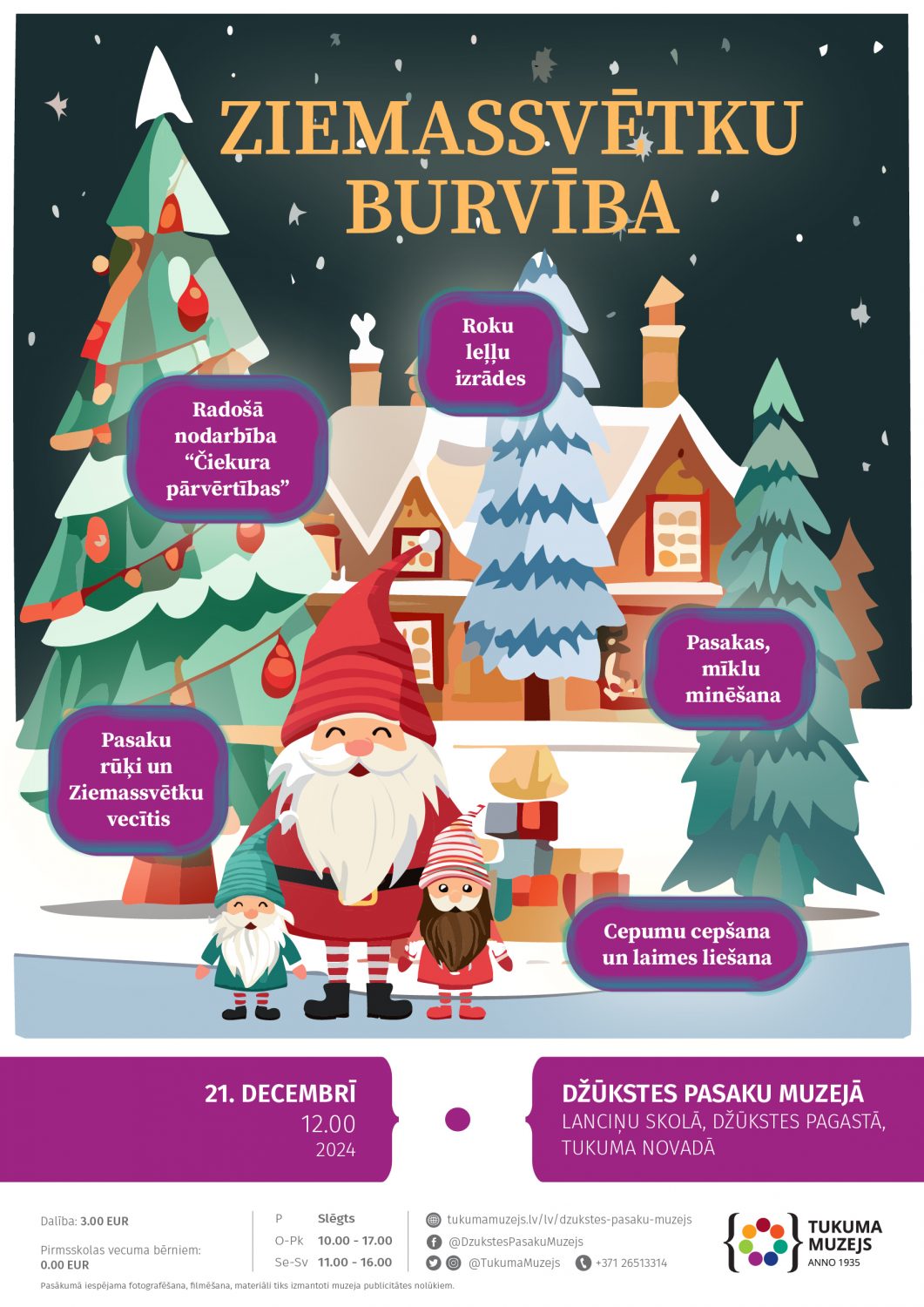 Pasākumā “Ziemassvētku burvība” dalībniekus sagaidīs Pasaku muzeja rūķi, kuri rosīsies, lai gatavotos Ziemassvētkiem, un aicinās ikvienu aktīvi līdzdarboties sarūpētajās aktivitātēs.. Varēs minēt mīklas, stāstīt pasakas un ticējumus, iet rotaļās un spēlēt roku leļļu izrādes. Radoši darboties aicinām nodarbībā “Čiekura pārvērtības”. Aicinām pievienoties kulinārā mantojuma daudzināšanā cept gardos Ziemassvētku cepumus pēc īpašas receptes, kā arī vārīt un kopīgi baudīt ābolu tēju Pasaku muzeja rūķi ikvienam palīdzēs izliet savu laimīti, lai uzzinātu, kas sagaida nākamajā 2025. gadā.