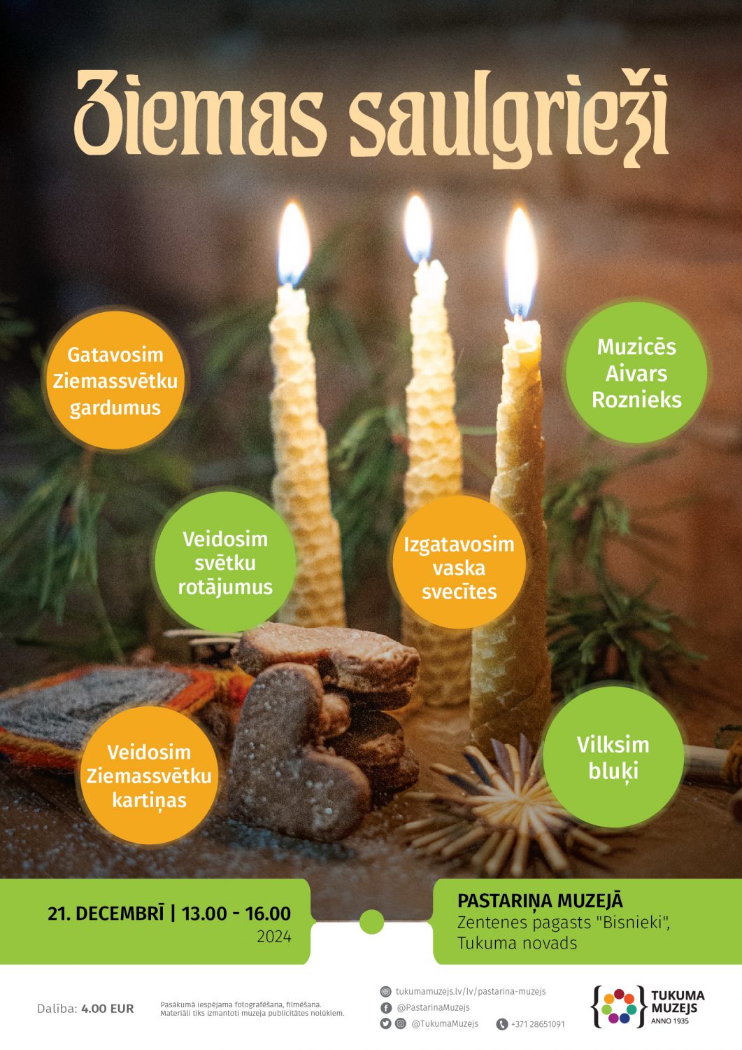 - decembrī 13.00-16.00 Pastariņa muzejā (Zentenes pagasts “Bisnieki”, Tukuma novadā) norisināsies Ziemas saulgriežu pasākums. Apmeklētāji aicināti uzzināt, kā savulaik Ziemassvētkus svinēja rakstnieka Ernesta Birznieka–Upīša bērnībā.