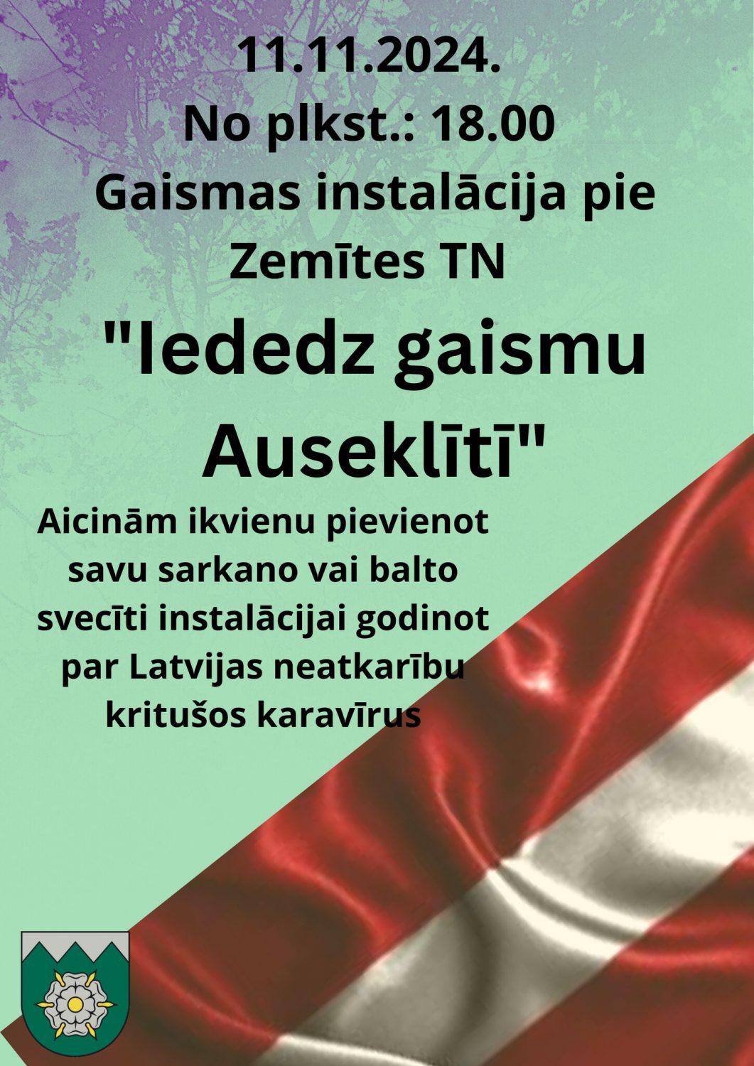 - Zemītē – plkst. 18:00 Gaismas instalācijas izveide. Pie Zemītes tautas nama (“Cerības”, Zemīte) par godu Lāčplēša dienai tiks veidota gaismas instalācija “Iededz gaismu Auseklītī”. Ikviens aicināts ierasties ar baltām vai sarkanām svecītēm, lai izveidotu spēka zīmi par godu kritušajiem karavīriem.