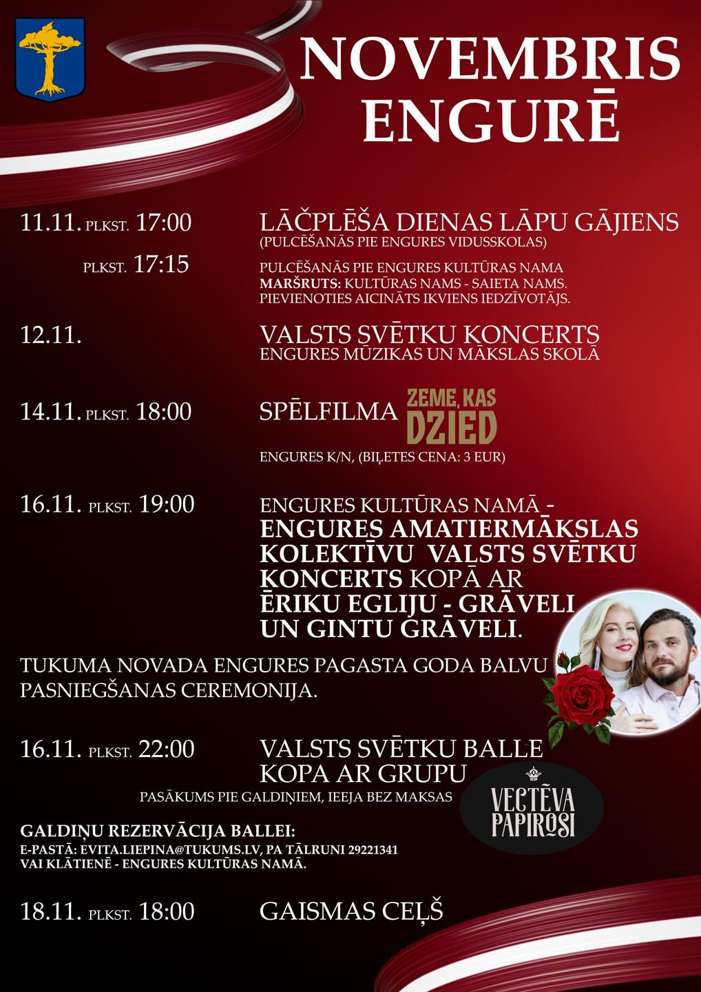 16. novembrī plkst. 19:00 Engures Kultūras namā norisināsies valsts svētku koncerts, kurā piedalīsies vietējie amatiermākslas kolektīvi, kā arī skatītājus priecēs Ērika Eglija-Grāvele un Gints Grāvelis. Pasākuma laikā tiks pasniegtas arī Engures pagasta goda balvas. Ieeja bez maksas.