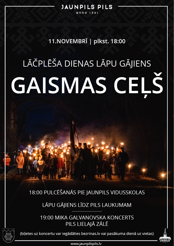 - Jaunpilī – plkst. 18:00 Lāčplēša dienas lāpu gājiens “Gaismas ceļš”. Pulcēšanās pie Jaunpils Vidusskolas (Skolas ielas galā). Gājiena noslēgums Jaunpils pils laukumā, un noslēgumā plkst. 19:00 iespēja noklausīties Mika Galvanovska koncertu Jaunpils pils Lielajā zālē. Biļetes pieejamas ŠEIT