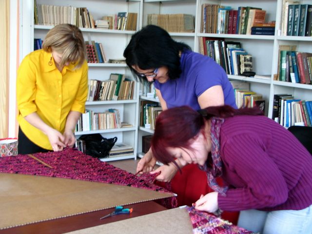 Tā par vakardienu sacīja tās desmit tukumnieces, kas audēju darbnīcā darināja sev šobrīd tik modernos ažūros trijstūra lakatus. Ja pie šādas atziņas dāmas palika pēc septiņu stundu stāvēšanas kājās, līkņāšanas un tupēšanas, piedevām vēl visu laiku griežot, stiepjot, verot un skaitot dzijas pavedienus, sienot mezglus un apdarinot bārkstis, tad… kādam varētu būt grūti noticēt šim apgalvojumam. Tāpēc – lai labāk stāsta fotogrāfijas, kurās redzama darbošanās un… apmierinātie smaidi – beigās! Tiesa gan,- šeit vairs nav visu dalībnieču, jo pirmais piecnieks, veiklākās un steidzīgākās „fotosesijas brīdī” ar saviem lakatiem jau bija devušās pilsētas ielās vai priecēt mājiniekus, palepoties ar patiesi skaistajiem darinājumiem.