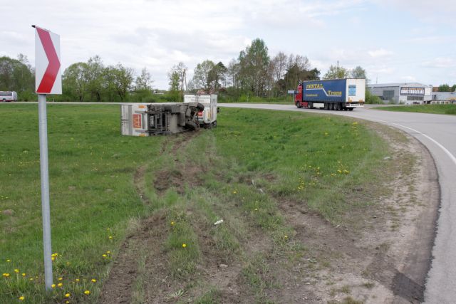 Šonakt 3.20 Rīgas-Ventspils šosejas apļveida krustojumā automašīna SCANIA 114L noskrēja no brauktuves un notrieca ceļazīmi. Cietušo nav. Avārijas iemesls – šoferis aizmidzis pie stūres.