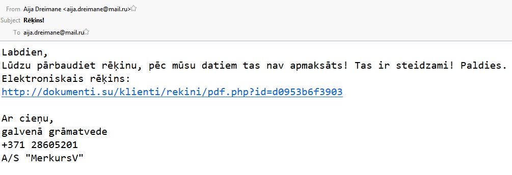 Šodien, 3. februārī, ap 15.07 elektroniska pasta vēstuli ar nosaukumu «Rēķina problēma» un «Rēķins» saņēmām arī mēs savā redakcijas e-pasta kastītē. E-pastus sūta kādas mistiskas personas ar vārdiem Gita Laube un Aija Dreimane. Ja redzat ienākam šādu e-pastu, izdzēsiet to un nekādā gadījumā, nemēģiniet atvērt pievienoto saiti.