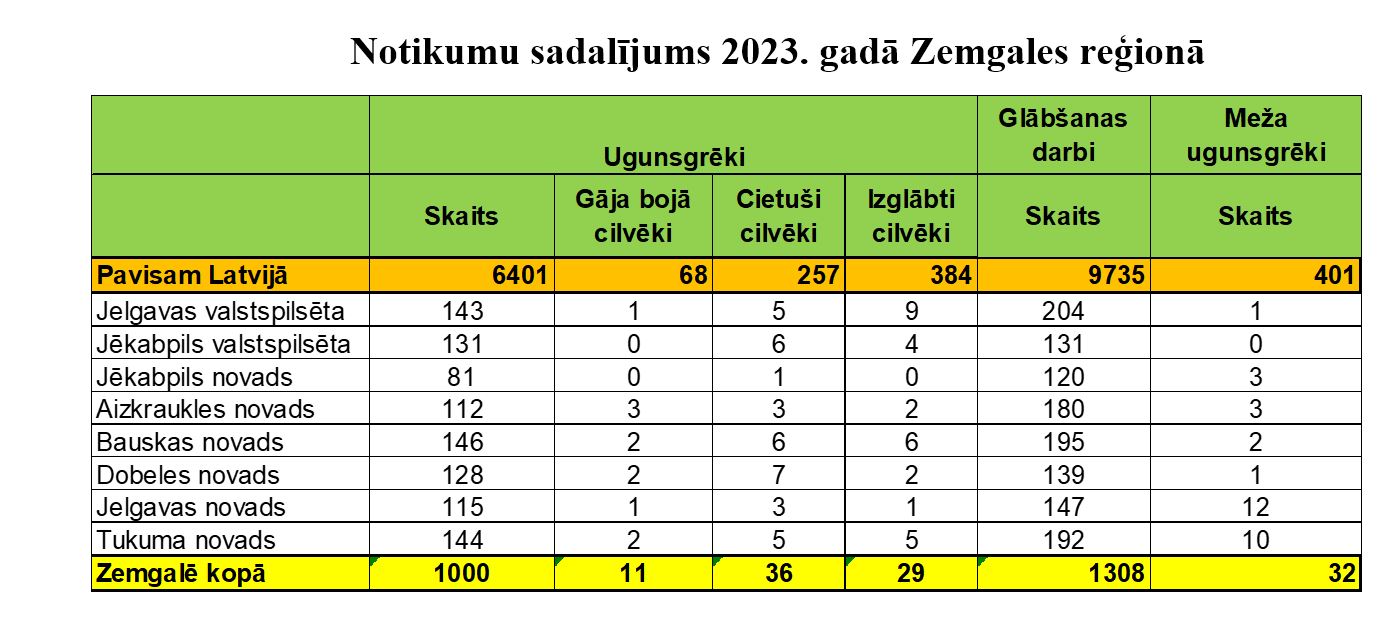 - gadā Zemgales reģionā nedaudz samazinājies kopējais izsaukumu skaits. VUGD Zemgales reģiona pārvaldes ugunsdzēsēji glābēji 2023. gadā devās uz 2815 notikumiem, no kuriem 1032 bija ugunsgrēki, 1308 glābšanas darbi, bet 475 izsaukumi bija maldinājums. Pirmo reizi vairāku gadu laikā Zemgalē samazinājās saņemto izsaukumu skaits uz glābšanas darbiem. Turpināja arī samazināties izsaukumu skaits uz ugunsgrēkiem.