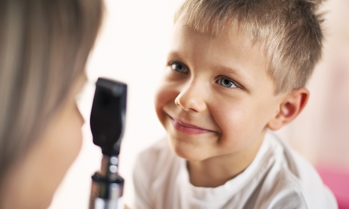 Smiling little boy aged 5 is looking at the doctor. The ophthalmologist is examining his eyes with ophthalmoscope.