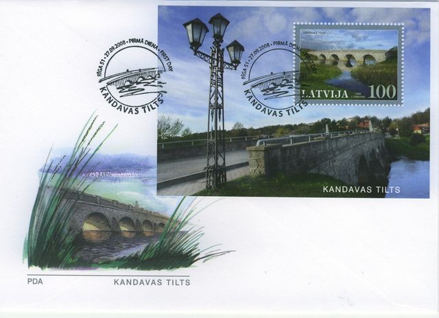 Arī uz pirmās dienas aploksnes un speciālā zīmoga attēlots tilts no dažādiem skatu punktiem. Pirmās dienas aploksni un speciālo zīmogu rotā uzraksts «Kandavas tilts».