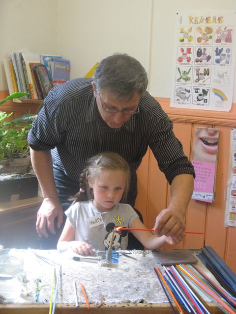 Nometnes pirmajā dienā bērni ar lielu aizrautību piedalījās keramikas nodarbībā, kuru vadīja keramiķis Uģis Dainis. Mākslinieka vadībā tapa brīnišķīgas vāzes, bļodas, svečturi, kurus vēlāk keramiķis apdedzināja savā malkas ceplī un noglazēja. Vēl šajā dienā bērni darbojās dekupāžas un pērļošanas darbnīcās – rotāja kastītes, vēra pērļu piekariņus, šuva mobilo telefonu maciņus. Turpmākajās dienās apguva arī papīru ziedu veidošanu, T kreklu noformēšanu dekupāžas tehnikā un citus darbiņus. Trešajā dienā nodarbības vadīja stikla pūtēji Artūrs un Andrejs Virbuļi no Ventspils – viņi rādīja, ka stikls ir tikpat viegls kā sniegpārslas un ļāva dalībniekiem pašiem pūst stiklu. Katrs varēja pagatavot stikla piekariņu, izmantojot krāsainus stiklus.