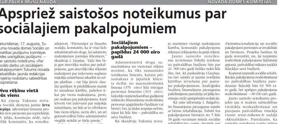 Kā skaidroja Tukuma novada Sociālā dienesta direktore Ina Balgalve, pansijas klientu materiālo stāvokli tas nepasliktinās, jo mainīsies vienīgi maksājumu kārtība, komunālo pakalpojumu rēķinam iekļaujoties kopējā rēķinā.