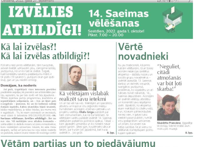 Nu jau tradicionāli, kā pirms katrām vēlēšanām, tā arī šoreiz aicinām redakcijas izvēlētus ekspertus – dažādu nozaru un sociālo grupu novadniekus – izvērtēt aizejošās, 13. Saeimas darbus un iezīmēt, viņuprāt, svarīgākos jautājumus, problēmas, ko vajadzētu un arī nāksies risināt nākamās, 14. Saeimas deputātiem. Aicinājām arī izvērtēt vēlētāju atbildību un komentēt savu iespējamo izvēli.