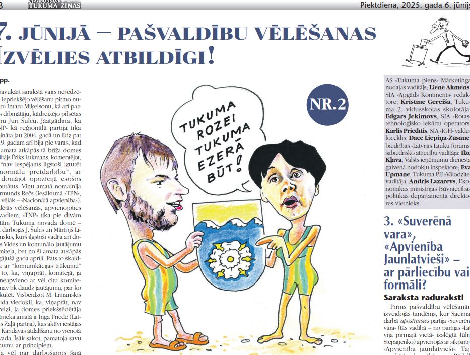 Turpinot tradīciju, arī pirms šīm vēlēšanām cenšamies sniegt palīdzīgu roku paši sev un jums, cienījamie lasītāji, neļaujoties apmaldīties daudzkrāsainajā deputātu kandidātu piedāvājumā. Te gan jāprecizē, ka tik plašs tas arī nemaz šoreiz nav, jo uz 19 vietām Tukuma novada domē pretendē vairs tikai septiņi saraksti un 126 kandidāti. (Salīdzinājumam – 2021. gadā saraksti bija deviņi, bet domē tikt gribētāji bija 180.)