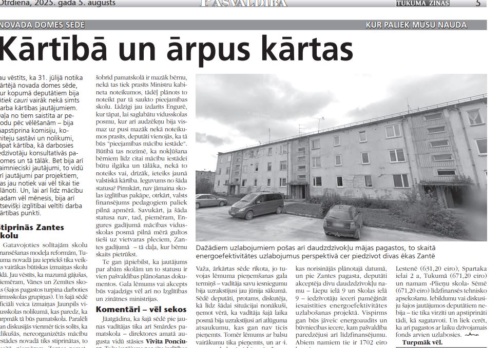 Līdzīgu ceļu iet arī citas mājas novadā un citu apsaimniekotāju vadībā. Tā, energoauditu veiks arī Lestenes «Veldrēs», kur līdzfinansējuma summa ir 632 eiro, Degoles pagasta «Rubeņos» (671,20 eiro), Lapmežciemā Liepu ielā 1 (675,20 eiro); Džūkstes «Cīruļos» (775,20 eiro), «Druvās» Lestenē (631,20 eiro), Spartaka ielai 2 a, Tukumā (671,20 eiro) un namam «Plieņu skola» Sēmē (671,20 eiro) līdzfinansēs tehnisko apsekošanu. Iebildumu vai diskusiju šajos jautājumos deputātiem nebija – tie tika virzīti un apstiprināti tādi, kā sagatavoti. Un liek cerēt, ka arī pagastos ar laiku dzīvojamais fonds arvien uzlabosies.