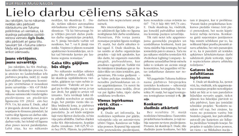 Jau rakstījām, ka SIA «Strabag», kam sākts likvidācijas process, bija atteicies no Lauktehnikas ielu pārbūves projekta, tādēļ 22. maijā pašvaldības iepirkumu komisija pēc izvērtēšanas ir nosaukusi jaunu uzvarētāju – SIA «GP Holding», kas konkursā bija nosaucis nākamo saimnieciski visizdevīgāko piedāvājumu un piedāvājis līgumcenu 119 218,64 eiro bez PVN. Un, kā atzina E. Dude, atkal ir jānogaida desmit dienas, kad ir iespējams šo lēmumu pārsūdzēt, lai varētu slēgt līgumu un darbus sākt. Cik zināms, uzņēmējs esot gatavs darbus veikt, bet šobrīd vēl līgumu abas puses neesot parakstījušas. Labā ziņa, ka no nākamās nedēļas, kā skaidroja E. Dude, tiešām sāksies automašīnu stāvlaukuma izbūve pie Tukuma slimnīcas: “Tā kā būvuzraugs bija vēlējies precizēt dažus punktus darba organizācijas projektā, tāpēc no 5. jūnija būvdarbi varbūt vēl nesāksies, bet 7. vai 8. maijā viss notiks. Vispirms ir plānots nomainīt apakšzemes komunikācijas un tikai tad būvnieks ķersies pie laukuma seguma nomaiņas.”