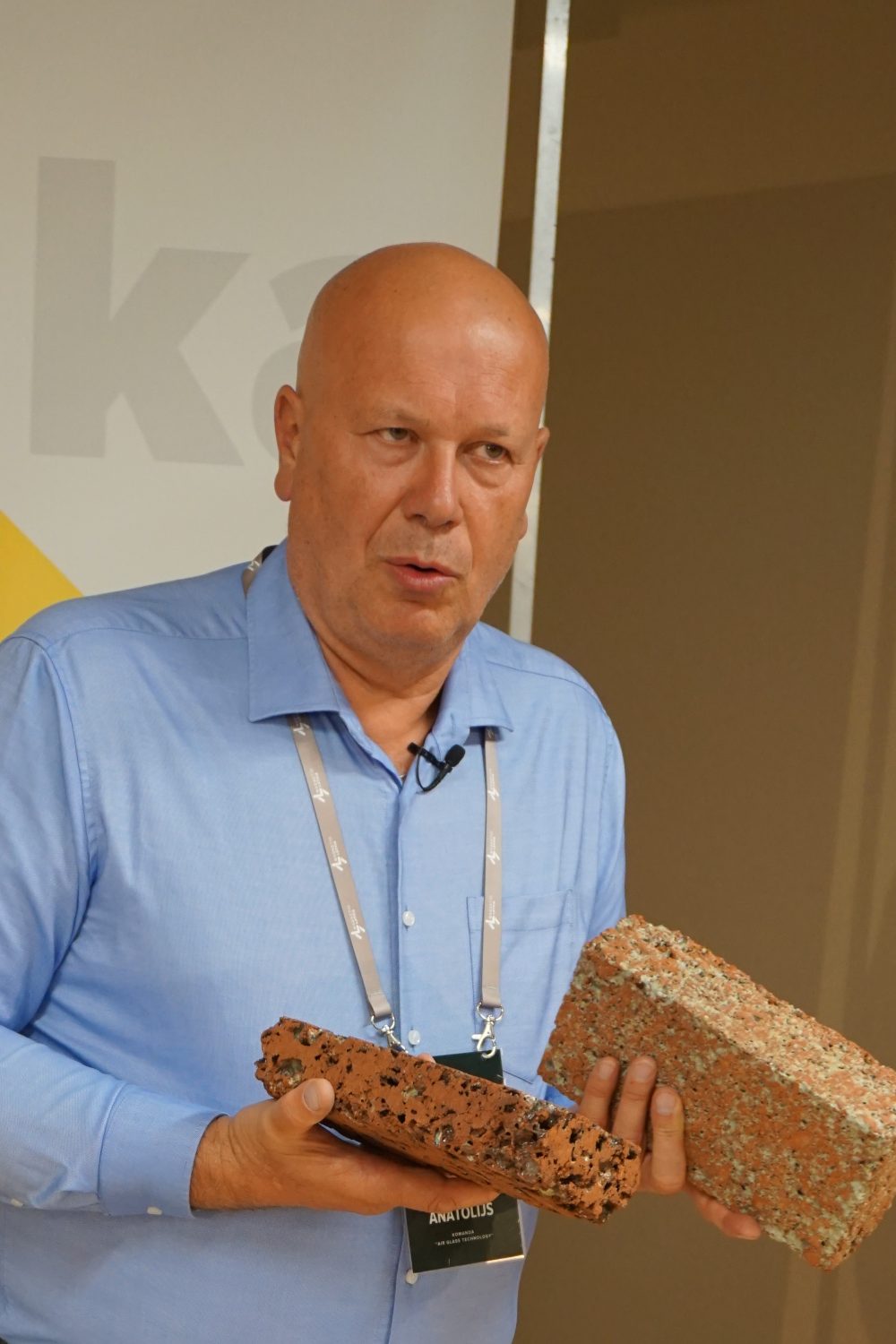 Hakatona uzvarētāju komandas “Air Glass Technology” pārstāvis Anatolijs Trumpels par to, kā strādājuši ar ideju veidot māla un stikla šķiedras ķieģeļus, paskaidro: “Šī ir milzīga problēma visas Eiropas mērogā. Poligonā savestie stikla šķiedras ražošanas pārpalikumi nav atkritumi, tas ir resurss. Mūsu piedāvājuma priekšrocības – vajag mazāk enerģijas nekā parasto ķieģeļu ražošanā, mūsu ķieģelis ir labs gan siltumizolācijā, gan kā dizaina materiāls. Tas ir viegls, līdz ar to ar vienas un tās pašas kravnesības transportu mēs varam aizvest divreiz vairāk ķieģeļu.”
