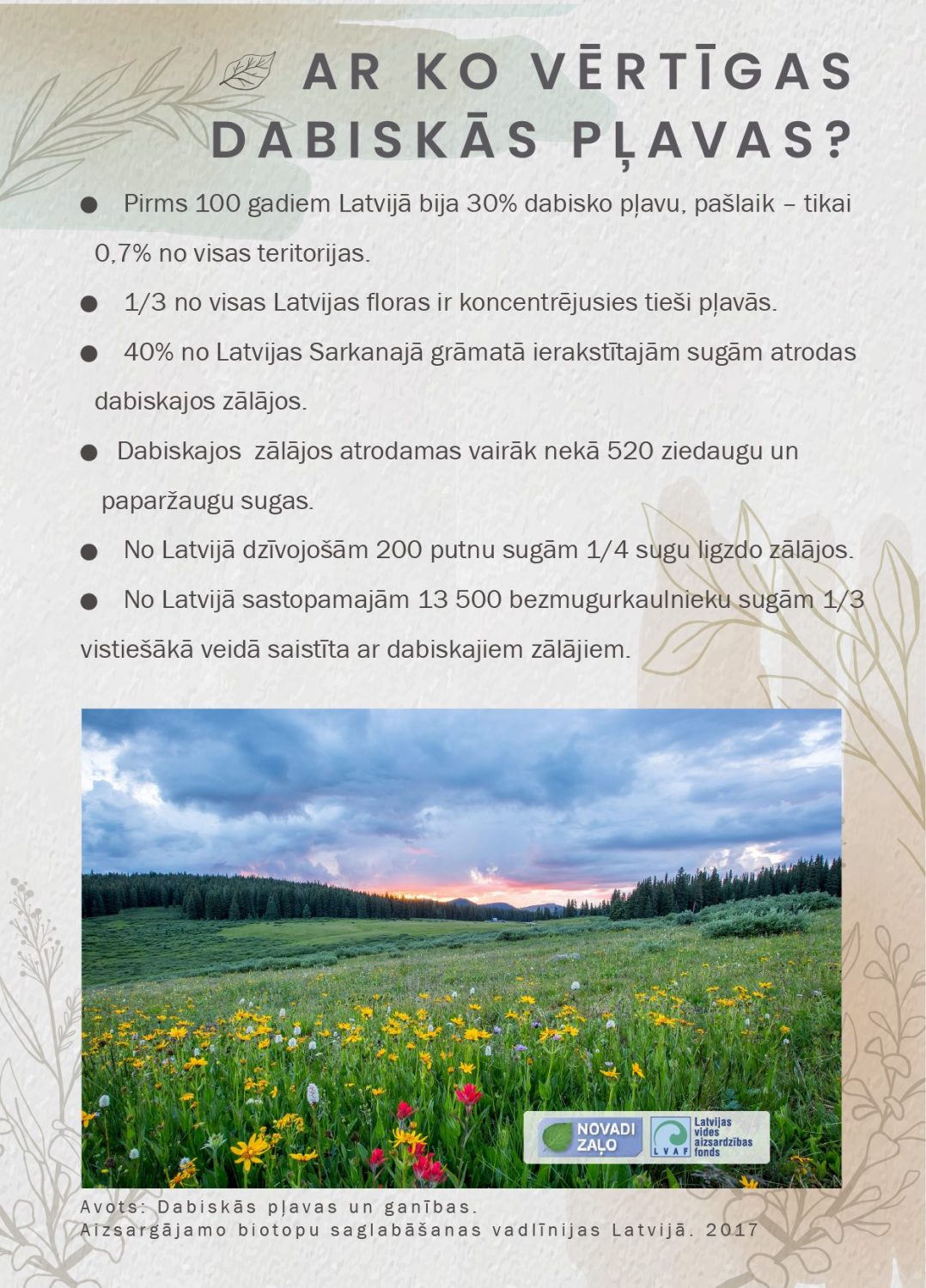 Dabiskās pļavas ir sugām vispiesātinātākās ekosistēmas. Ļoti labās pļavās varētu būt ap 50 sugu. “Tik daudzu sugu sēkliņas mēs nevarējām piegādāt, taču varējām piedāvāt cilvēkiem bagātināt zemi ar Latvijas dabiskajiem augiem,” stāsta dabisko pļavu atbalsta kustības “Iesēj savu kvadrātmetru!” koordinatore Rūta Sniedze-Kretalova. Daļu sēklu savāca mazpulki, piedalījās arī LDF eksperti.