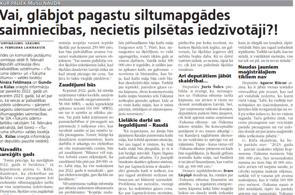 I. Liepiņš skaidroja, ka pašvaldības uzņēmums «Krants» visus ieguldījumus spēj veikt no uzņēmuma līdzekļiem, grāmatvedis turpina strādāt, un pašvaldības Audita nodaļa palīdz, bet Juridiskā nodaļa strādā pie reorganizācijas plāna: “No pagājušās nedēļas ir valdes loceklis (Dzintars Rušmanis, SIA «Kandavas komunālie pakalpojumi» valdes loceklis. – Red.), kas šo darbu koordinēs līdz uzņēmuma sadalīšanai, par ko jau esam lēmuši. Kas attiecas uz «Tukuma ūdeni», uzņēmumam ir jāaudzē sava kapacitāte – būs vajadzīgi speciālisti, tehniskais personāls, tomēr mēs uzskatām – ja uzņēmums saņem jaunus klientus, kas savukārt nodrošina kapitālsabiedrības attīstību un peļņu, papildus finansējums tam nav nepieciešams.”G. Cīrule iebilda, ka, pieņemot darbā jaunus darbiniekus, viņu atalgojums tarifā nebūs iekļauts, bet izmaksas uzņēmumam radīsies – kas tās segs?! Deputāts Juris Šulcs, piekrītot G. Cīrules viedoklim, atzina – ja pašvaldība uzdod kaut ko darīt, tad pašiem jābūt atbildīgiem par to, kā šis darbs tiks veikts: “Manā skatījumā ir nepareizi, ka mēs uzdodam darīt reālus darbus, bet līdzi nedodam ne santīmu. Patiesībā tas nozīmē, ka Tukuma pilsētas iedzīvotāji visu to apmaksā. Ja ir darbi, kas prasa naudu, tie ir jāfinansē, un tad var rēķināt vienotu tarifu, bet ja nē – aicināšu diskutēt par dalīto tarifu, jo tukumniekiem nav jāfinansē ieguldījumi pagastos!” I. Liepiņš skaidroja, ka šobrīd tas ir darbinieku un laika resurss, jo visu pārējo «Krants» sedz no saviem līdzekļiem, bet – ja būs kapitālieguldījumi, tie ir jāatmaksā. J. Šulcs iebilda: ”Milzkalnē, kā tikko dzirdēts, jau tagad ir veikti lieli ieguldījumi, taču izskatās, ka mums ir vienalga, kur uzņēmums tam ņem naudu, bet tā nedrīkst – lēmuma pieņēmēja ir atbildīgs par funkciju izpildi un finansējumu!” G. Važa atzina, ka Milzkalnes saimniecība iepriekš bijusi privātās rokās, tāpēc tur pašvaldībai ietekmes nebija, bet ja Milzkalnē ir ieguldījumi, tie jāsedz no Smārdes pagasta pārvaldes budžeta. Rezumējot, kā atzina komitejas priekšsēdētājs Mārtiņš Limanskis, pašvaldībai stāv priekšā liels darbs, lai sakārtotu to, kas ir sakārtojams šajā jomā, un lai tiktu ievērotas vides prasības, piemēram, attiecībā uz Lapmežciemu.