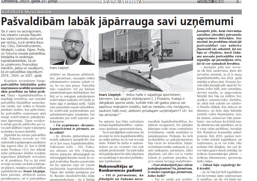 Jāpiebilst ka astoņu pašvaldību vidū Tukuma novads no 100 maksimāli iespējamajiem punktiem bija ieguvis tikai 23, kas ir labāk nekā Preiļiem (11), bet sliktāk nekā pārbaudes labākā rezultāta ieguvējam Jēkabpils novadam ar 46 punktiem. Par to, kā vērtē revīzijā secināto un kādi uzlabojumi plānoti, runājām ar pašvaldības izpilddirektoru Ivaru Liepiņu, kura pārziņā, atbilstoši amata pienākumiem, arī ir pašvaldības kapitālsabiedrību uzraudzība.