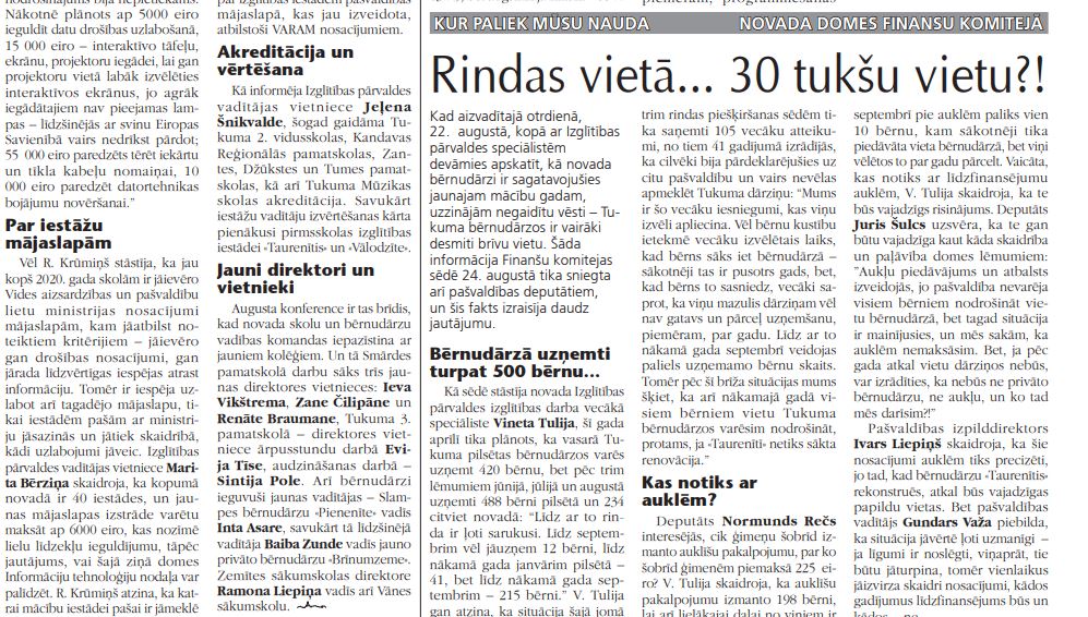 Kā sēdē stāstīja Novada Izglītības pārvaldes izglītības darba vecākā speciāliste Vineta Tulija, šī gada aprīlī tika plānots, ka vasarā Tukuma pilsētas bērnudārzos varēs uzņemt 420 bērnu, bet pēc trim lēmumiem jūnijā, jūlijā un augustā uzņemti 488 bērni pilsētā un 234 citviet novadā: “Līdz ar to rinda ir ļoti sarukusi. Līdz septembrim vēl jāuzņem 12 bērni, līdz nākamā gada janvārim pilsētā – 41, bet līdz nākamā gada septembrim – 215 bērni.” V. Tulija gan atzina, ka situācija šajā jomā esot ļoti mainīga, piemēram, pēc trim rindas piešķiršanas sēdēm tika saņemti 105 vecāku atteikumi, no tiem 41 gadījumā izrādījās, ka cilvēki bija pārdeklarējušies uz citu pašvaldību un vairs nevēlas apmeklēt Tukuma dārziņu: “Mums ir šo vecāku iesniegumi, kas viņu izvēli apliecina. Vēl bērnu kustību ietekmē vecāku izvēlētais laiks, kad bērns sāks iet bērnudārzā – sākotnēji tas ir pusotrs gads, bet, kad bērns to sasniedz, vecāki saprot, ka viņu mazulis dārziņam vēl nav gatavs un pārceļ uzņemšanu, piemēram, par gadu. Līdz ar to nākamā gada septembrī veidojas paliels uzņemamo bērnu skaits. Tomēr pēc šī brīža situācijas mums šķiet, ka arī nākamajā gadā visiem bērniem vietu Tukuma bērnudārzos varēsim nodrošināt, protams, ja «Taurenītī» netiks sākta renovācija.”