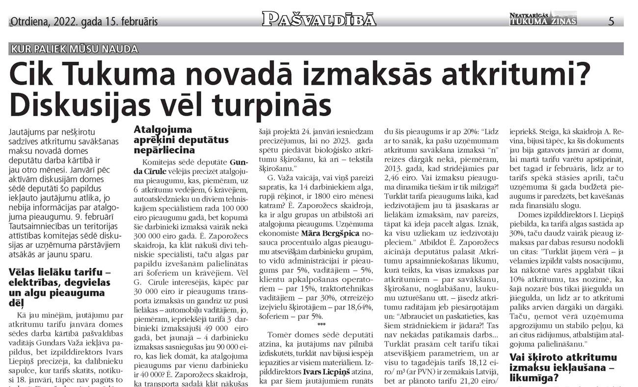 Domes izpilddirektors I. Liepiņš piebilda, ka tarifā algas sastāda ap 30%, taču daudz vairāk pieaug izmaksas par dabas resursu nodokli un citas: ”Turklāt jāņem vērā – ja vēlamies izpildīt valsts nosacījumu, ka nākotnē varēs apglabāt tikai 10% atkritumu, tas nozīmē, ka šajā nozarē būs tikai jāiegulda un jāiegulda, un līdz ar to atkritumi paliks arvien dārgāki un dārgāki. Taču, ņemot vērā uzņēmuma apgrozījumu un stabilo peļņu, kā arī citus rādījumus, atbalstījām atalgojuma palielināšanu.”