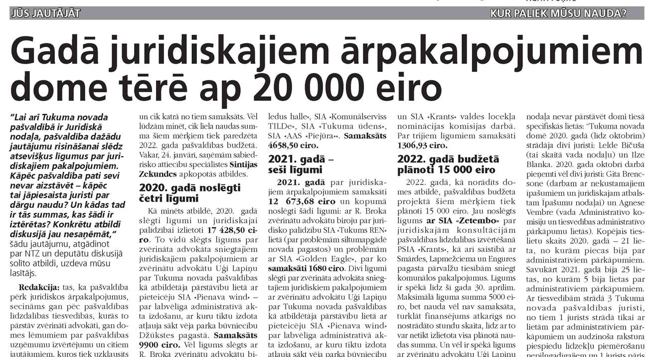 Kur paliek mūsu nauda? ”Lai arī Tukuma novada pašvaldībā ir Juridiskā nodaļa, pašvaldība dažādu jautājumu risināšanai slēdz atsevišķus līgumus par juridiskajiem pakalpojumiem. Kāpēc pašvaldība pati sevi nevar aizstāvēt – kāpēc tai jāpiesaista juristi par dārgu naudu? Un kādas tad ir tās summas, kas šādi ir iztērētas? Konkrētu atbildi diskusijā jau nesaņēmāt,” šādu jautājumu, atgādinot par...