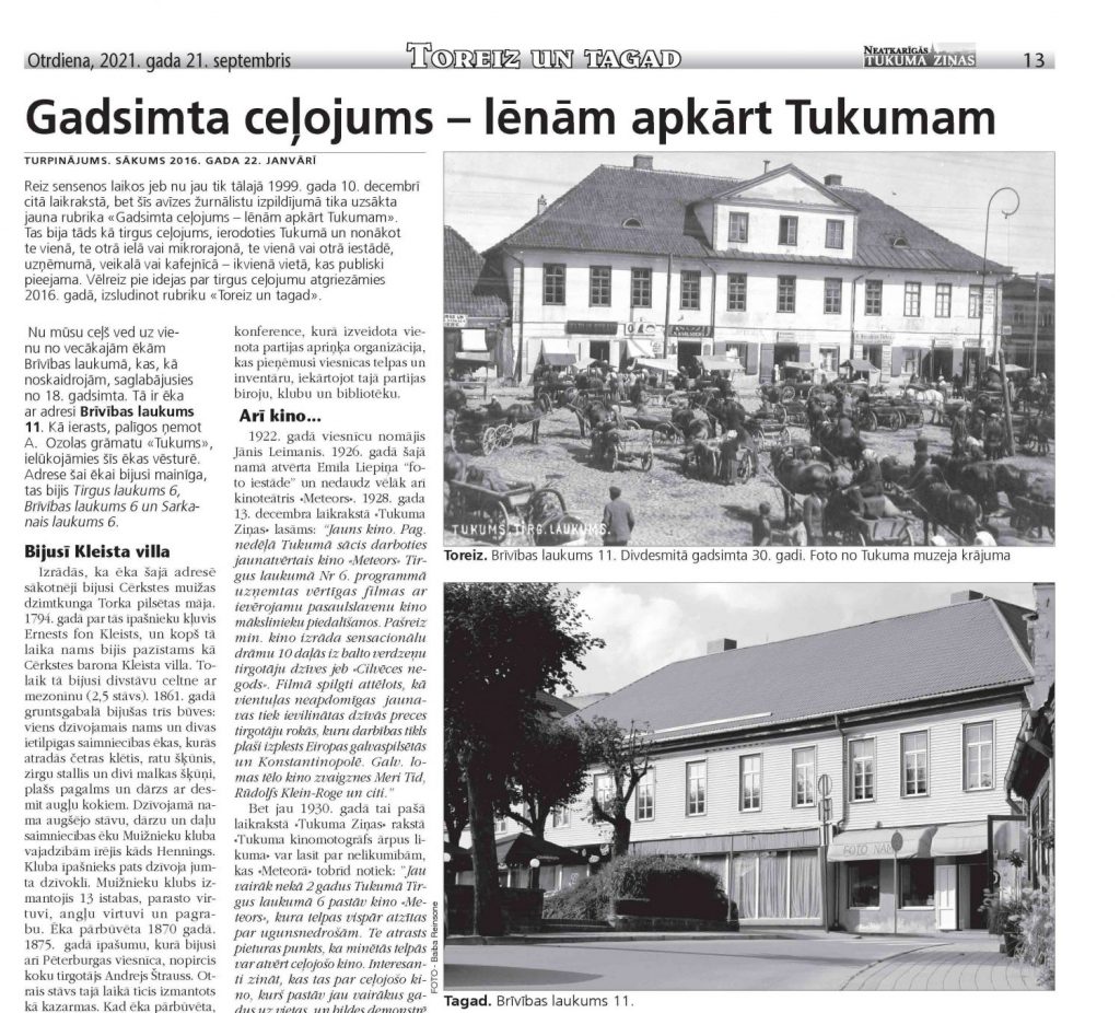 - gadā viesnīcu nomājis Jānis Leimanis. 1926. gadā šajā namā atvērta Emīla Liepiņa “foto iestāde” un nedaudz vēlāk arī kinoteātris «Meteors». 1928. gada 13. decembra laikrakstā «Tukuma Ziņas» lasāms: “Jauns kino. Pag. nedēļā Tukumā sācis darboties jaunatvērtais kino «Meteors» Tirgus laukumā Nr 6. programmā uzņemtas vērtīgas filmas ar ievērojamu pasaulslavenu kino mākslinieku piedalīšanos. Pašreiz min. kino izrāda sensacionālu drāmu 10 daļās iz balto verdzeņu tirgotāju dzīves tirgotāju jeb «Cilvēces negods». Filmā spilgti attēlots,