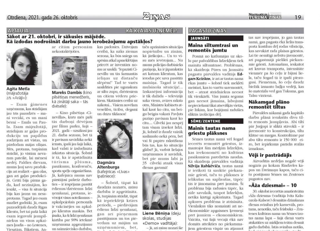 – Kino pilsētiņa «Cinevillas», kuru mēs paši tās darboņi dēvējam par filmu parku, šajā – 2021. gadā – uzsākusi jau 21. darba sezonu, bet tā ir pavisam savādāka nekā ierasts, īpaši jau šajā laikā, kad valstī ir izsludināta ārkārtas situācija. Šobrīd ir tā, ka ir apstādināta tūrisma plūsma, pasākumu, konferenču, sporta spēļu organizēšana. Jā, kafejnīca mums nav pārstājusi pašreiz darboties – ir iespējams pasūtīt ēdienus/dzērienus līdzi ņemšanai, protams ievērojot visus noteikumus – apkalpojošais personāls ir vakcinējies un apkalpo klientus maskās. Bet jāsaka, ka šī līdzi ņemšanas kārtība par 90% ietekmē uzņēmuma apgrozījumu un saimniecisko darbību, jo cilvēki speciāli nebrauc pie mums, lai paņemtu ēdienu līdzi ņemšanai, viņiem patīk arī pasēdēt un pabaudīt atmosfēru, tāpēc būsim spiesti arī kafejnīcu pašreiz – no 1. novembra – vērt ciet. Esam gan mazliet vīlušies jaunajos noteikumos, jo bijām sagatavojušies klientus uzņemt laukā – stacionārajās terasēs, tāpēc papildus uzstādījās 10 nojumēs, kur ērti varētu maltīti ieturēt atsevišķas mājsaimniecības, bet nu arī tas nav atļauts.
