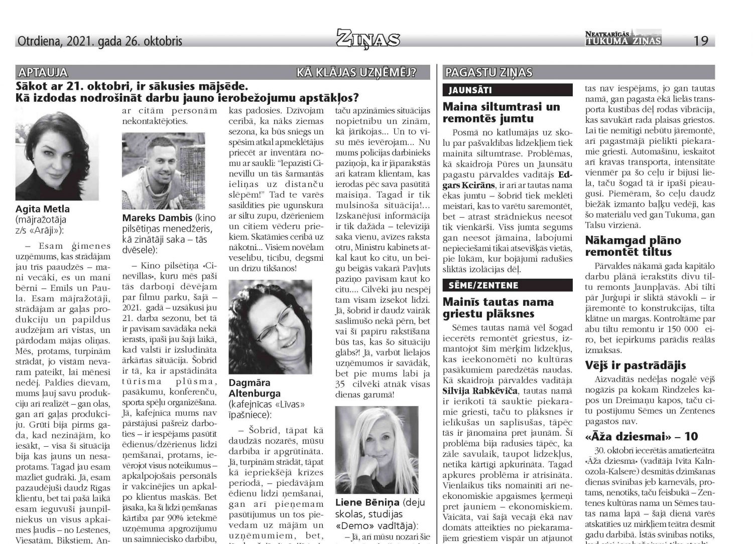 – Šobrīd, tāpat kā daudzās nozarēs, mūsu darbība ir apgrūtināta. Jā, turpinām strādāt, tāpat kā iepriekšējā krīzes periodā, – piedāvājam ēdienu līdzi ņemšanai, gan arī pieņemam pasūtījumus un tos pievedam uz mājām un uzņēmumiem, bet, jāsaka, šajā situācijā to ir mazāk, jo daudzi strādā attālināti – no mājām. Tāpēc vismaz šobrīd liekas, ka, salīdzinot ar iepriekšējo ārkārtas situāciju, klientu loks ir samazinājies… Bet vēl jau grūti tā pateikt, jo mājsēdē nupat tikai ir sākusies. Var teikt, ka iepriekš jau šādā režīmā bijām iestrādājušies, bet nu lielākās problēmas sagādā tieši birokrātija. Mums nepietiek, ka pie durvīm ir uzlikts brīdinājums, ka pie mums ir nedroša vide (vakcinējušies ir visi darbinieki, bet pieņemam arī nevakcinētos klientus), ka jāievēro divu metru distance, ka zālē vienlaicīgi var atrasties 10 cilvēki, ka visur ir dezinfekcijas līdzekļi. Nu ir tā, ka no rīta, atnākot uz darbu, ir arī jāaizpilda veidlapas un jāparakstās par to, ka nav nekādu simptomu, jāpieraksta pulkstenis, cikos ienāk un cikos iziet. Tas viss veido tādu situācija, ka es pa dienu nesataisu tik daudz ēdiena porciju, cik aizpildu dažādus papīrus. Mēs taču apzināmies situācijas nopietnību un zinām, kā jārīkojas… Un to visu mēs ievērojam… Nu mums policijas darbinieks paziņoja, ka ir jāparakstās arī katram klientam, kas ierodas pēc sava pasūtītā maisiņa. Tagad ir tik mulsinoša situācija!… Izskanējusī informācija ir tik dažāda – televīzijā saka vienu, avīzes raksta otro, Ministru kabinets atkal kaut ko citu, un beigu beigās vakarā Pavļuts paziņo pavisam kaut ko citu…. Cilvēki jau nespēj tam visam izsekot līdzi. Jā, šobrīd ir daudz vairāk saslimušo nekā pērn, bet vai šī paīru rakstīšana būs tas, kas šo situāciju glābs?! Jā, varbūt lielajos uzņēmumos ir savādāk, bet pie mums labi ja 35 cilvēki atnāk visas dienas garumā!