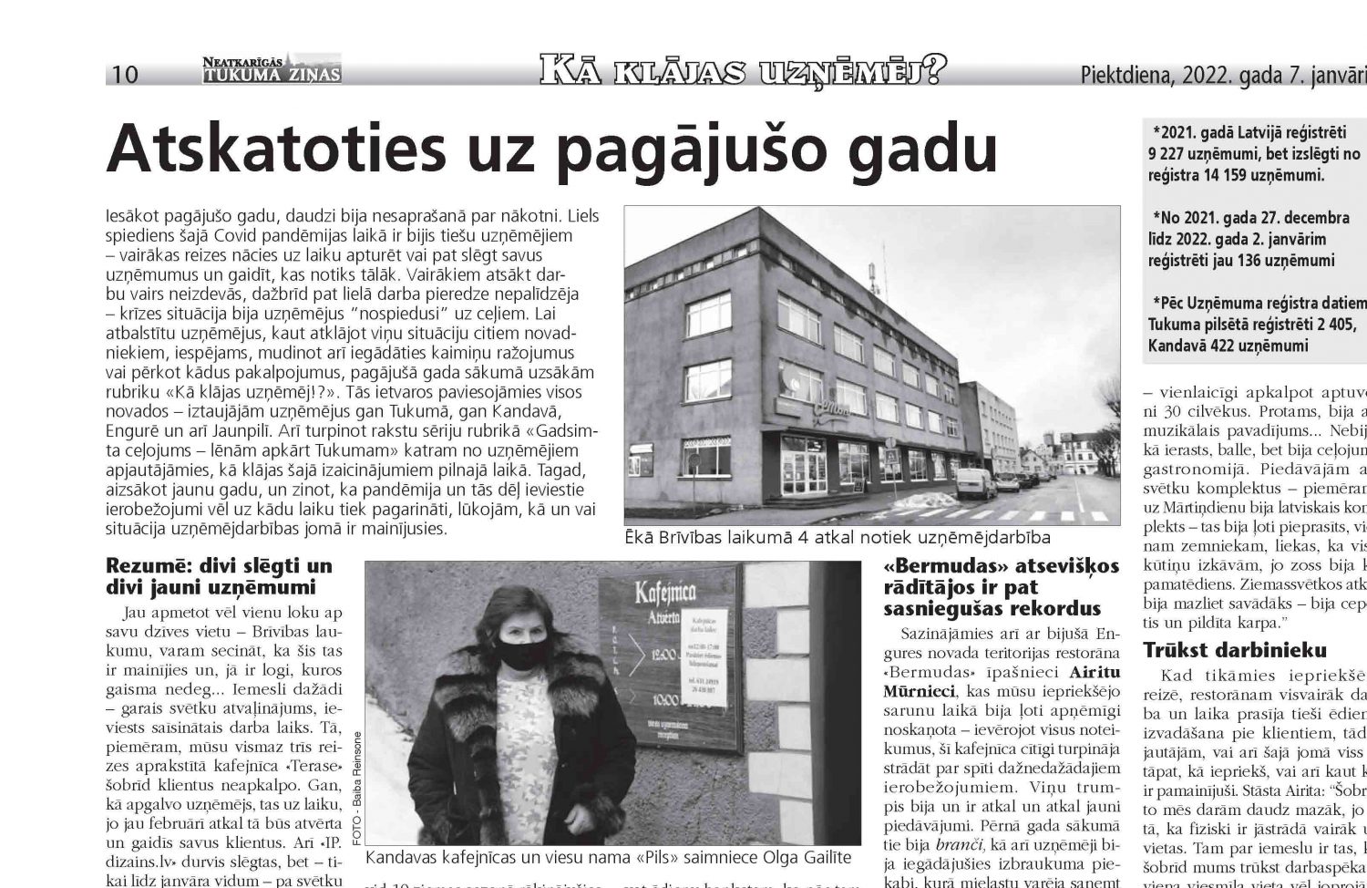 Iesākot pagājušo gadu daudzi bija nesaprašanā par nākotni. Liels spiediens šajā Covid pandēmijas laikā ir bijis tiešu uzņēmējiem – vairākas reizes nācies uz laiku apturēt vai pat slēgt savus uzņēmumus un gaidīt, kas notiks tālāk. Vairākiem atsākt darbu vairs neizdevās, dažbrīd pat lielā darba pieredze nepalīdzēja – krīzes situācija bija uzņēmējus “nospiedusi” uz ceļiem. Lai atbalstītu uzņēmējus, kaut atklājot viņu situāciju citiem novadniekiem, iespējams, mudinot arī iegādāties kaimiņu ražojumus vai pērkot kādus pakalpojumus, pagājušā gada sākumā uzsākām rubriku «Kā klājas uzņēmēj!?». Tās ietvaros paviesojāmies visos novados – iztaujājām uzņēmējus gan Tukumā, gan Kandavā, Engurē un arī Jaunpilī. Arī turpinot rakstu sēriju rubrikā «Gadsimta ceļojums – lēnām apkārt Tukuma» katram no uzņēmējiem apjautājāmies, kā klājas šajā izaicinājumiem pilnajā laikā. Tagad, aizsākot jaunu gadu un zinot, ka pandēmija un tās dēļ ieviestie ierobežojumi vēl uz kādu laiku tiek pagarināti, lūkojām, kā un vai situācija uzņēmējdarbības jomā ir mainījusies.