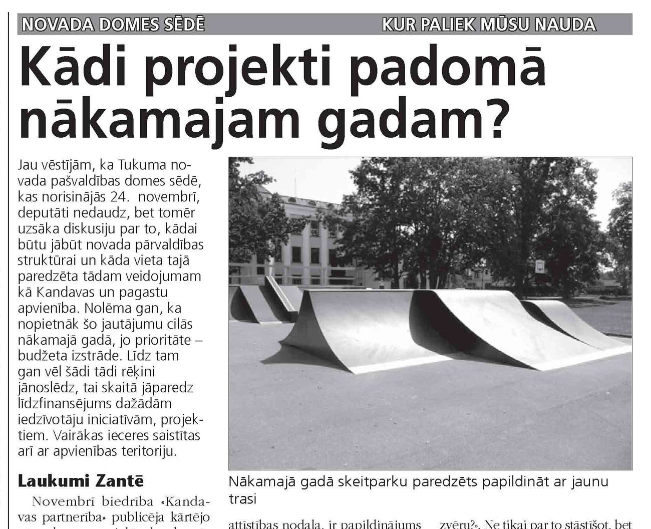 Jau vēstījām, ka Tukuma novada pašvaldības domes sēdē, kas norisinājās 24. novembrī, deputāti nedaudz, bet tomēr uzsāka diskusiju par to, kādai tad būtu jābūt novada pārvaldības struktūrai un kāda vieta tajā paredzēta tādam veidojumam kā Kandavas un pagastu apvienība. Nolēma gan, ka nopietnāk šo jautājumu cilās nākamajā gadā, jo prioritāte – budžeta izstrāde. Līdz tam gan vēl šādi tādi rēķini jānoslēdz, tai skaitā jāparedz līdzfinansējums dažādām iedzīvotāju iniciatīvām, projektiem. Vairākas ieceres saistītas arī ar apvienības teritoriju.