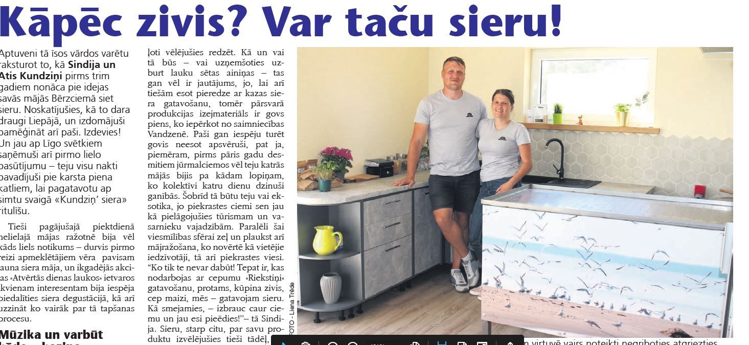 Aptuveni tā īsos vārdos varētu raksturot to, kā Sindija un Atis Kundziņi pirms trim gadiem nonāca pie idejas savās mājās Bērzciemā siet sieru. Noskatījušies, kā to dara draugi Liepājā un izdomājuši pamēģināt arī paši. Izdevies! Un jau ap Līgo svētkiem saņēmuši arī pirmo lielo pasūtījumu – teju visu nakti pavadījuši pie karsta piena katliem, lai pagatavotu ap simtu svaigā «Kundziņ’ siera» ritulīšu.