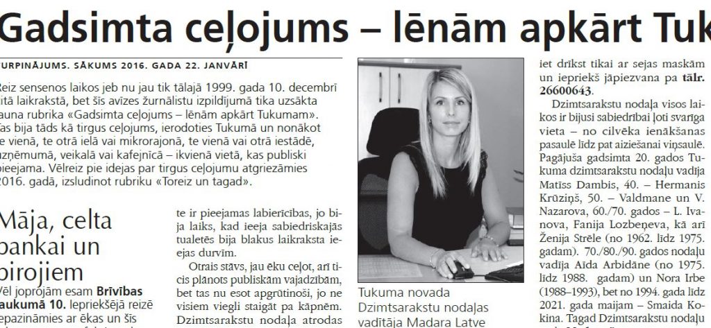 Bet kas notiek šodien – kāda kārtība, piemēram, reģistrējot laulības? To jautājām pašreizējai vadītājai Madarai Latvei, kura darbu Tukuma dzimtsarakstu nodaļa uzsāka tikai pagājušā nedēļā. Viņa pastāstīja: “Dzimtsarakstu nodaļa veic civilstāvokļa faktu reģistrāciju, kas nozīmē jaundzimušā reģistrāciju, cilvēka miršanas faktu reģistrācija (bez maksas) un, protams, veic arī laulības reģistrāciju, kas ir maksas pakalpojumu – valsts nodeva 14 eiro. Tālākās izmaksas ir atkarīgas arī no tā, kāda ceremonija tiek pasūtīta, vai tā ir viesu klātbūtnē, kas būs dārgāk, vai bez viesiem, kas būs lētāk. Vietējiem, kas ir deklarēti Tukuma novadā, arī tiek piemērota atlaide. Vēl viens maksas pakalpojums ir izbraukuma laulība, kad mūsu darbinieki dodas uz cilvēku izvēlētu vietu un salaulā tur. Tas, protams, ir dārgāk un izmaksās 150 eiro (ceļa izmaksas iekļautas samaksā).