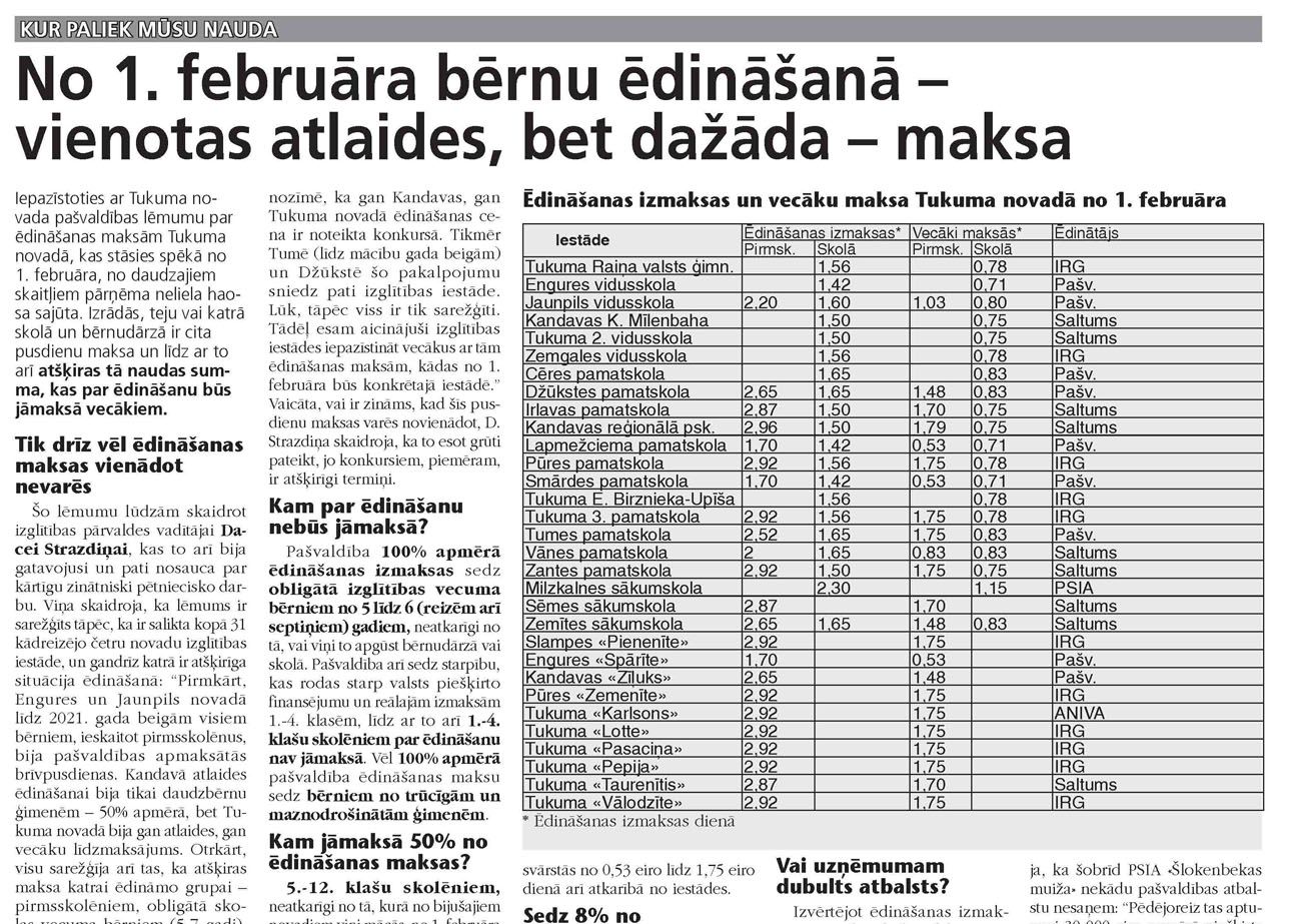Šo lēmumu lūdzām skaidrot izglītības pārvaldes vadītājai Dacei Strazdiņai, kas to arī bija gatavojusi un pati nosauca par kārtīgu zinātniski pētniecisko darbu. Viņa skaidroja, ka lēmums ir sarežģīts tāpēc, ka ir salikta kopā 31 kādreizējo četru novadu izglītības iestāde, un gandrīz katrā ir atšķirīga situācija ēdināšanā: “Pirmkārt, Engures un Jaunpils novadā līdz 2021. gada beigām visiem bērniem, ieskaitot pirmsskolēnus, bija pašvaldības apmaksātās brīvpusdienas. Kandavā atlaides ēdināšanai bija tikai daudzbērnu ģimenēm – 50% apmērā, bet Tukuma novadā bija gan atlaides, gan vecāku līdzmaksājums. Otrkārt, visu sarežģīja arī tas, ka atšķiras maksa katrai ēdināmo grupai – pirmsskolēniem, obligātā skolas vecuma bērniem (5-7 gadi), sākumskolai un 5.-12. klašu grupai. Treškārt, novados atšķiras arī pakalpojumu sniedzēji – bijušā Engures novada izglītības iestādēs ēdināšanu lielākoties nodrošina pati iestāde. Kandavā – kā iepriekš, tā tagad – ēdina komersants – SIA «Saltums Kandavā», Tukuma novadā šobrīd ir pat trīs līgumi ar komersantiem, no kuriem divi – SIA «IRG» un SIA «Saltums Kandavā» – nodrošina ēdināšanu lielākajā daļa izglītības iestāžu. Tas nozīmē, ka gan Kandavas, gan Tukuma novadā ēdināšanas cena ir noteikta konkursā. Tikmēr Tumē (līdz mācību gada beigām) un Džūkstē šo pakalpojumu sniedz pati izglītības iestāde. Lūk, tāpēc viss ir tik sarežģīti. Tādēļ esam aicinājuši izglītības iestādes iepazīstināt vecākus ar tām ēdināšanas maksām, kādas no 1. februāra būs konkrētajā iestādē.” Vaicāta, vai ir zināms, kad šīs pusdienu maksas varēs novienādot, D. Strazdiņa skaidroja, ka to esot grūti pateikt, jo konkursiem, piemēram, ir atšķirīgi termiņi.