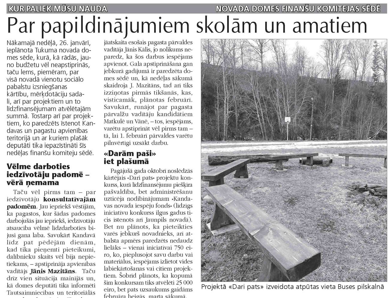 Pagājušā gada oktobrī noslēdzās kārtējais «Dari pats» projektu konkurss, kurā līdzfinansējumu piešķīra pašvaldība, bet administrēšanu uzticēja nodibinājumam «Kandavas novada iespēju fonds» (līdzīgs iniciatīvu konkurss ilgus gadus ticis īstenots arī Jaunpils novadā). Bet nu plānots, ka pieteikties varēs jebkurš novadnieks, arī atbalsta apmērs paredzēts nedaudz lielāks – vienai iniciatīvai 750 eiro, ko, pieplusojot savu darbu vai materiālus, iespējams izlietot vides labiekārtošanas vai citiem projektiem. Šobrīd plānots, ka kopumā šim konkursam tiks atvēlēti 25 000 eiro, bet pats uzsaukums gaidāms februāra beigās, marta sākumā.