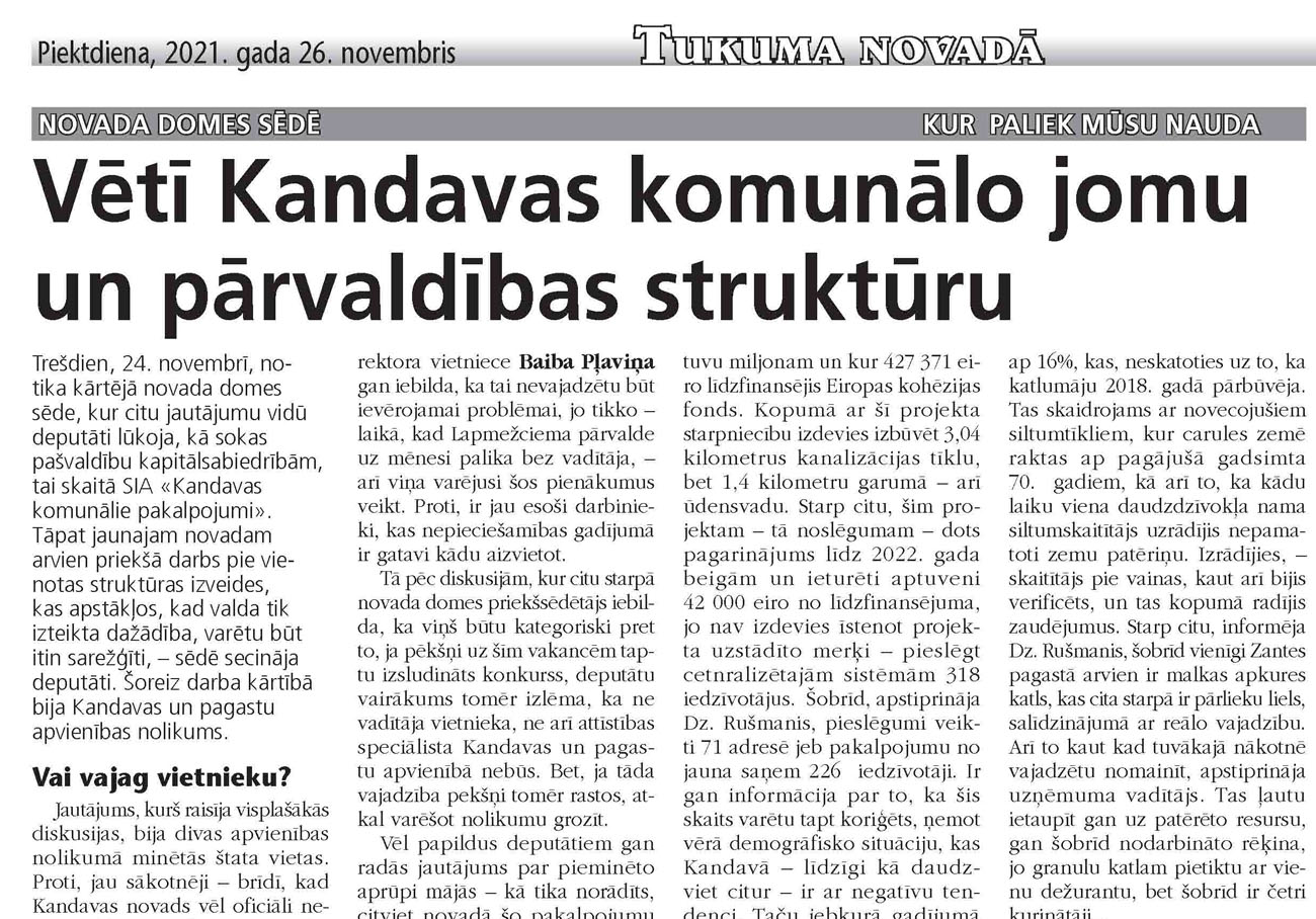 Sēdē deputāti ar balsojumu apstiprināja arī novada komunālo saimniecību pārskatus, kurus sīkāk analizēja jau 10. novembrī – Vides un komunālo jautājumu komitejā. Prezentāciju par esošo situāciju, kā arī nākotnes plāniem bija sagatavojis SIA «Kandavas komunālie pakalpojumi» vadītājs Dzintars Rušmanis. Viņš skaidroja, ka kopumā šis gads uzņēmumam ir bijis itin vēlīgs, īpaši, ja salīdzina ar 2020. gadu, kad piedzīvots ievērojams ieņēmumu kritums, ko visvairāk ietekmējusi tā gada siltā ziema. Nu plusā ir aptuveni 51 000 eiro, kas liek cerēt, ka arī gads kopumā noslēgsies pozitīvi. Ir gan augušas ražošanas izmaksas, bet tajā pašā laikā par aptuveni 14 500 eiro samazinājušies administratīvie izdevumi. Tāpat izdevies sarucināt debitoru parādu apmēru, kas lielā mērā – pateicoties uzņēmuma juristam, skaidroja Dz. Rušmanis. Proti, tie šobrīd ir 105 502 eiro (vairākums jeb ap 68 000 eiro – privātpersonu parādi), kas ir par aptuveni 35 000 mazāk nekā vēl gadu iepriekš. Vienīgais šobrīd varbūt ne tik iepriecinošais rādītājs – uzņēmuma kredītu slogs, salīdzinot ar tā ieņēmumiem. Kopumā vēl arvien uzņēmumā ir aizņemti aptuveni seši miljoni, kas savukārt ierobežo iespējas aizņemties vēl nebūt ko papildus. Viens no pēdējiem apjomīgajiem aizņēmumiem bija ūdenssaimniecības projektam Kandavas pilsētā, kura izmaksas ir tuvu miljonam un kur 427 371 eiro līdzfinansējis Eiropas kohēzijas fonds. Kopumā ar šī projekta starpniecību izdevies izbūvēt 3,04 kilometrus kanalizācijas tīklu, bet 1,4 kilometru garumā – arī ūdensvadu. Starp citu, šim projektam – tā noslēgumam – dots pagarinājums līdz 2022. gada beigām un ieturēti aptuveni 42 000 eiro no līdzfinansējuma, jo nav izdevies īstenot projekta uzstādīto mērķi – pieslēgt centralizētajām sistēmām 318 iedzīvotājus. Šobrīd, apstiprināja Dz. Rušmanis, pieslēgumi veikti 71 adresē jeb pakalpojumu no jauna saņem 226 iedzīvotāji. Ir gan informācija par to, ka šis skaits varētu tapt koriģēts, ņemot vērā demogrāfisko situāciju, kas Kandavā – līdzīgi kā daudzviet citur – ir ar negatīvu tendenci. Taču jebkurā gadījumā jaunu pieslēgumu vēl nedaudz pietrūkst, un uzņēmuma vadītājs atzina, ka ieturētā summa viņu apjomiem nebūt nav maza.