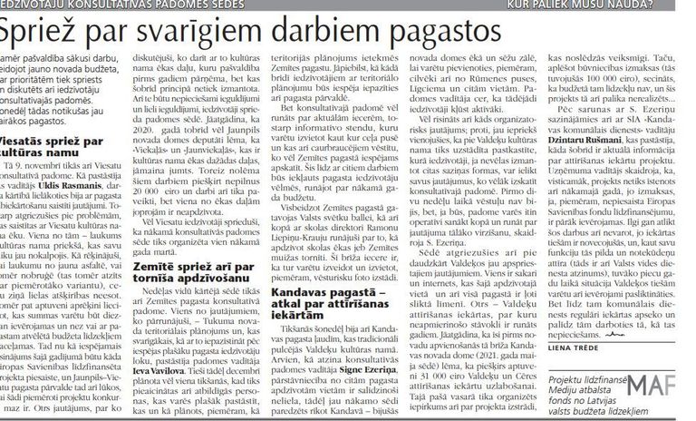 Kamēr pašvaldība, sākusi darbu, veidojot jauno novada budžeta, par prioritātēm tiek spriests un diskutēts arī iedzīvotāju konsultatīvajās padomēs. Šonedēļ tādas notikušas jau vairākos pagastos.