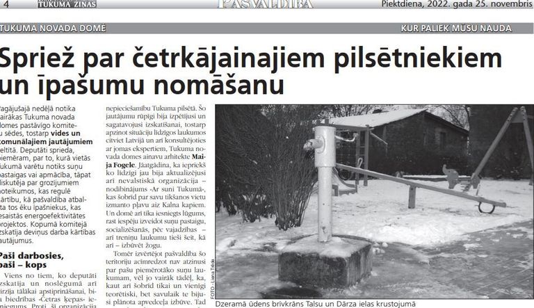 Pagājušajā nedēļā notika vairākas Tukuma novada domes pastāvīgo komiteju sēdes, tostarp vides un komunālajiem jautājumiem veltītā. Deputāti sprieda, piemēram, par to, kurā vietās Tukumā varētu notiks suņu pastaigas vai apmācība, tāpat diskutēja par grozījumiem noteikumos, kas regulē kārtību, kā pašvaldība atbalsta tos ēku īpašniekus, kas iesaistās energoefektivitātes projektos. Kopumā komitejā izskatīja deviņus darba kārtības jautājumus.