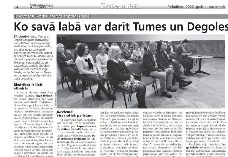 27. oktobrī notika Tumes un Degoles pagasta iedzīvotāju konsultatīvo padomju kopīga sanāksme, kurā tika pārrunāts, kas abos pagastos šogad izdarīts un ko vēl varētu izdarīt, aktivizējot biedrību darbu un tā piesaistot papildu finansējumu. Tikšanos, kurā piedalījās arī pašvaldības vadītājs Gundars Važa un viņa vietniece Inga Priede, vadīja Tumes un Degoles pagastu pārvaldes vadītāja Lidija Legzdiņa.