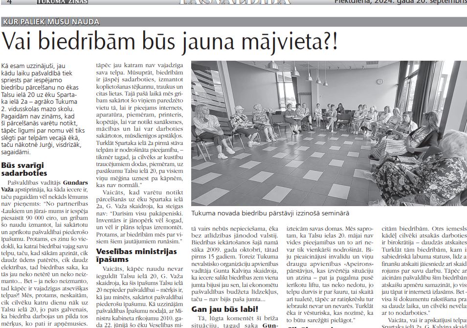 Vaicāta, vai ir apskatījusi telpas Spartaka ielā 2a, G. Kalviņa skaidroja, ka ir bijusi šajā ēkā un telpas pirmajā stāvā redzējusi: “Šī vieta tiks veidota kā kopienu centrs, un, domāju, ja tam būs jauns un aktīvs vadītājs, kas pamodinās biedrības uz aktīvu darbību, viss būs kārtībā. Bet šādam vadītājam, tāpat kā tas tagad ir Smārdē, ir jābūt. Cik zināms, kaut kas vēl tiks remontēts, līdz ar to gaidīsim, kad viss tiks pabeigts. Esmu pārliecināta, ka viss, kas notiek, notiek uz labu. Līdz tam turpināsim strādāt Talsu ielā 20 un gaidīsim mūsu biedrībās jaunus dalībniekus.”
