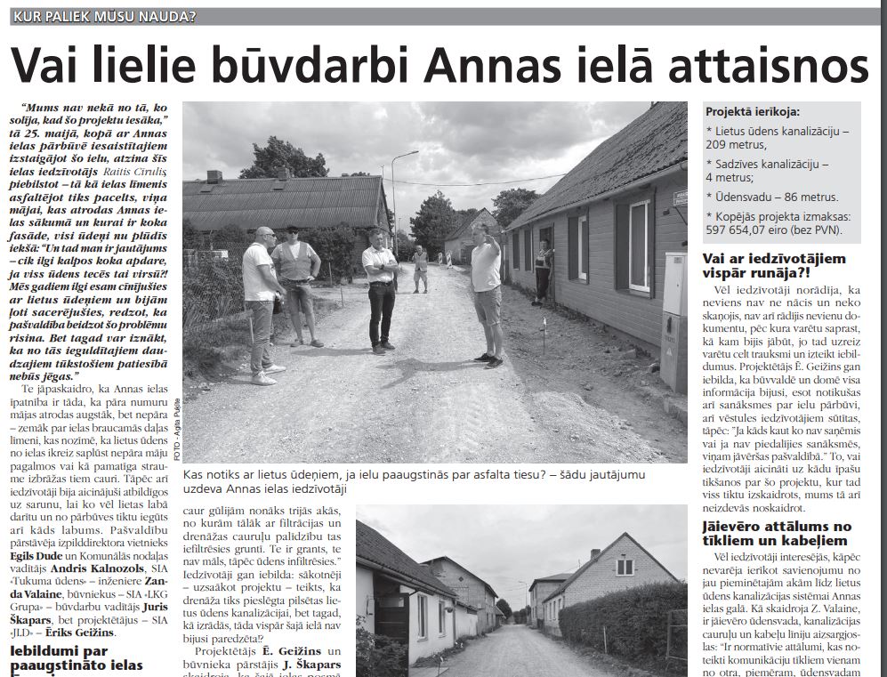 Par to, ka Annas ielā lietus laikā ir problēmas ar virszemes ūdeņiem, esam rakstījuši gadiem, turklāt ūdens postījis ne tikai iedzīvotāju īpašumus – lietavās nereti pati iela tika pamatīgi izskalota. 2017. gadā toreizējais komunālās nodaļas vadītājs Ģirts Ruģelis skaidroja, ka darbiem jānotiek secīgi – vispirms jāsakārto Kurzemes un Progresa iela, ierīkojot tur lietus ūdens kanalizāciju, un tad varēs šos darbus turpināt Annas un Kalna ielā. Kā zināms, darbi Kurzemes ielā paveikti jau sen, pēc tam arī Progresa iela tika sakārtota, un – gods, kam gods – 2021. gada pavasarī noslēdzās iepirkums pārbūves darbu projektēšanai Annas, Kalna, Miera un Magoņu ielā, bet gadu vēlāk tika organizēts arī iepirkums. Tiesības projektēt ieguva SIA «JLD», bet būvēt – SIA «LKG Grupa». Tātad, viss tiešām notika, kā solīts, – pēc kārtas, bet… Nu izrādījies,… ka iedzīvotāju gaidas ir viena lieta, bet tas, kas rakstīts dokumentos, – pavisam cita. Diemžēl, tik ilgi par šo problēmu runājot, nevienam pat prātā nevarēja ienākt, ka pašvaldība, lai arī uzdeva izstrādāt atjaunošanas projektu ielai, tai skaitā lietus ūdens atvadei būvdarbu robežās, tomēr tieši šādu uzdevumu projektētājiem neuzdeva! Kā minēts tehniskajā specifikācijā, Annas ielā bija jāprojektē infiltrācija un/vai lietus kanalizācijas izbūve posmā no Progresa līdz Talsu ielai, šķērsojot Talsu ielu un paredzot izteci īpašumā Revolūcijas iela 8 (esošajā grāvī aiz ietves). Savukārt Kalna ielā lietus ūdens atvadei jāparedz infiltrācija un/vai lietus kanalizācijas izbūve, cik iespējams, uz Annas ielas lietus ūdens kanalizācijas kolektoru. Tomēr, kā tagad redzam, ir ierīkota tikai infiltrācija, kas netiek saistīta ar centralizēto lietus ūdens kanalizāciju. Vai šis risinājums atrisinās to problēmu, par ko gadiem sūdzējās iedzīvotāji, redzēsim jau pirmajās lietavās, bet vai tad kaut ko vēl varēs mainīt?!…