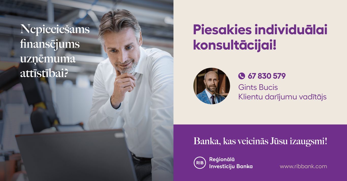 “Reģionālā investīciju banka” ir uzticams finanšu partneris ar 24 gadu pieredzi, kas nodrošina individuālu pieeju katram uzņēmējam, izdevīgus nosacījumus un ātru lēmumu pieņemšanu. Banka atbalsta vidējos un lielos Latvijas uzņēmumus, piedāvājot kreditēšanu, pilna spektra finanšu pakalpojumus un digitālus risinājumus ērtai ikdienas finanšu pārvaldībai.