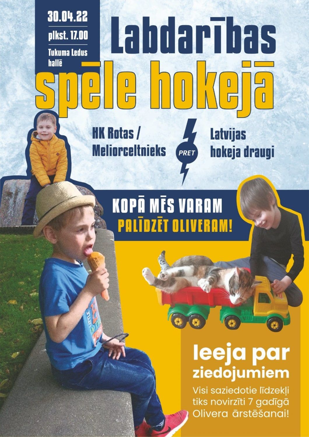 Hokeju spēli, kā ierasts, būs iespēja vērot par ziedojumiem, kas šogad tiks vākti Oliveram. Zēns ar mammas palīdzību par sevi raksta: