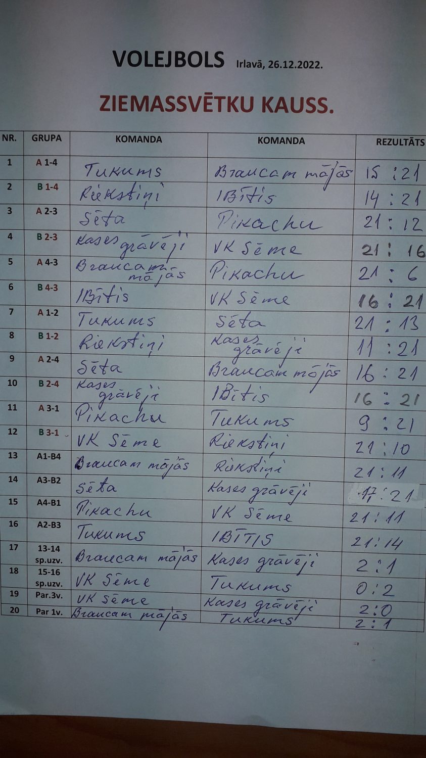 Astoņas komandas tika sadalītas divās apakšgrupās, kurās cīnoties, pēc rezultātiem tika pie izslēgšanas spēļu pāriem. Ceturtdaļfinālā sacensības beidza komandas «Pikachu» (Oļegs Trofimovs, Mareks Utkins, Lāsma Ķimene, Krišs Jēcis), «Riekstiņi» (Ulvis Ansbergs, Toms Zālmanis, Ojārs Rutkis,Nauris Belovs), «SĒTA» (Uldis Bēniņš, Andris Sikerins, Edgars Ozoliņš, Ilmārs Bodnieks), «Ibītis» (Rainers Lācis, Ivo Dāvis, Imants Tolkačovs, Agris Misa). Spēlē par trešo vietu sacentās komandas «VK Sēme» (Reinis Patmalnieks, Kristaps Jaunzems, Jānis Parfinovičs, Dāvids Sniedze) un «Kases grāvēji» (Brāļi Niks, Daniels, Ainis Miķelsoni un Sandris Baumanis). Divos setos uzvaru svinēja Sēmes volejbolisti. Finālā tikās komandas «Tukums» (Mārcis, Kristaps, Ernests, Sandis) pret Talsu «Braucam mājās» (Sandijs, Jānis, Juris, Singurs). Uzvarētāju noskaidrošanai bija nepieciešami visi trīs seti. Spēles beigās veiksmīgāki izrādījās komandas «Braucam mājās» spēlētāji. Kopā sacensībās tika aizvadītas 20 spēles. Paldies visiem par dalību sacensībās, paldies tiesnešiem Madaram un Jurim, kuri atvēlēja savu svētku dienu volejbolam! Paldies Irlavas pagasta pārvaldei un IKU «AMSA» par piparkūku smaržas un atmosfēras radīšanu!