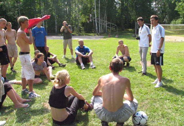 Tuvojās dienas, vidus un termometra stabiņš jau tiecās pāri 30°C atzīmei, bet, neskatoties uz to, «Dzīvesprieka» sporta laukumā par paguruma neviens nesūdzējās, jo katra domas un darbības tika koncentrētas futbolam. Kā pareizi sagatavoties treniņam, kā spēlei, kās veiksmīgāk ieraidīt bumbu vārtos, ko darīt un ko nepieļaut laukumā? Šīs un citas ar azartisko sporta veidu futbolu saistītas gudrības un prasmes jauniešiem demonstrēja Kristaps Blanks. Vārtus sargāja pats Uvis Helmanis, atzīstot, ka adaptēties futbola laukumā basketbolistam nemaz nav grūti, viņš ar prieku dod padomus jauniešiem, tos uzmundrina un iegūst pa kādai atziņai no pārējiem sportistiem un ikdienas, ko pavada šeit sporta nedēļā. Arī K. Blanks teic, ka allaž atbalsta šādas aktivitātes un šurp braucis labprāt, ne tikai tālab, ka viņš ir tukumnieks. Pēc spraigās spēles visi kopā pārrunāja spēles gaitu, panākumus un kļūdiņas, secinot, ka kopumā bija labi pastrādāts.